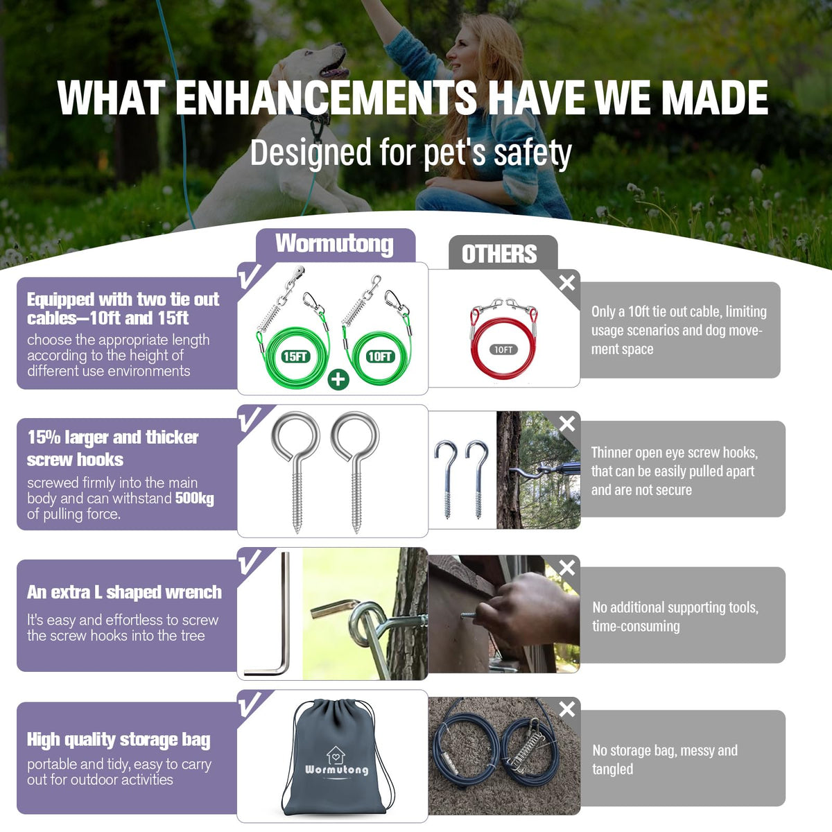 Introducing Our Upgraded Dog Runner For Your Yard - The Perfect Outdoor Dog Lead For Large Dogs Up To 250Lbs! Our Heavy-Duty Dog Trolley System Comes With A 75Ft Long Lead Cable And 2 Tie Out Cables Of 10Ft And 15Ft, Providing Ample Space For Your Furry Friend To Run And Play In The Backyard, At The Park, Or While Camping. This Reinforced And Durable Long Dog Leash Cable Is Designed To Is To Keep Runner Dogs Safe, Ensuring That They Are Securely Restrained And Unable To Escape, Ensuring The Safety And Comfort Of Your Pet. Our Long Dog Lead Is Made From Stainless Steel Wire That Is Chew-Resistant And Rust-Proof, Making It Perfect For Long-Term Use. The Pvc Coating Protects The Cable From Abrasion And Fading, Adding To Its Longevity. This Dog Zlip Line Aerial Run Is Easy To Set Up And Can Be Installed Between Two Sturdy Trees Or Posts. Take Your Furry Friend Along On Your Outdoor Adventures With Our Dog Trolley System. Make Your Dog Feel Free To Run While Sustaining Its Safety And Comfort With Our Outside Heavy Duty Long Dog Run Cable.