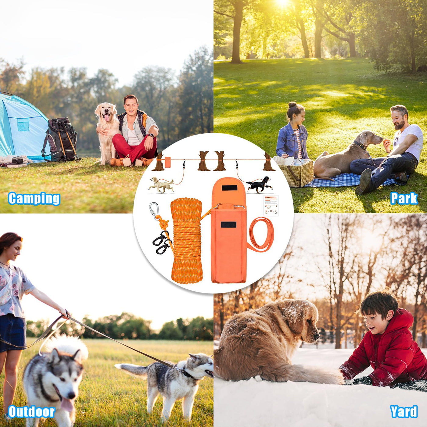 ??Portable dog leash: The dog overhead cable has its own portable storage bag. Compact and easy to carry. The package also includes a carrying bag for carrying and storage. When you walk your dog in camping parks yards gardens and other places you can also hang your handbag on the rope to release your hands.