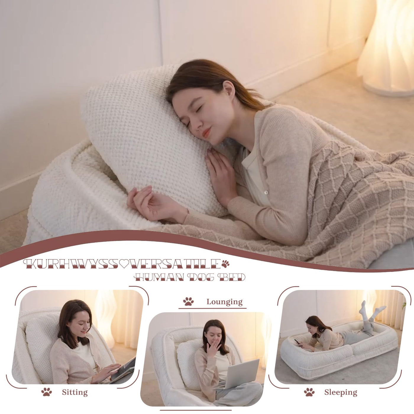 Outstanding Features Of Our Adjustable Human Dog Bed: ?? Multifunctional Use - 5 Angles Adjustable The 5 Angles Are Adjustable So You Can Find A Comfortable Position To Relax. ?? Comfortable & Soft Support - So You Can Relax Better High-Density Sponge-Filled Cushions And 2 Large Pillows Provide You With Soft Support. ?? Solid & Stable Framework - Good Load Bearing & Long Life The Solid Metal Frame Provides Great Stability And A Weight Capacity Up Of To 350 Lbs. ?? Easy To Install - Complete In A Moment Simply Slip The Metal Frame Over The Lazy Sofa To Complete The Installation. Item Specifications: Product Name: Human Dog Bed Upholstery Material: Polyester Frame Material: Metal Seat Construction: Foam Weight Capacity: 350 Lbs Product Dimensions: 69.27' * 34.65' * 10.63' Product Weight: 35.64 Lbs Tips: 1. Due To The Different Parameters Of Different Monitors, There May Be A Little Color Difference In The Color Display Of The Product. 2. Product Sizes Are Manually Measured, Manual Measurement Methods May Have 1~2 Cm Of Error, Please Refer To The Actual Product.