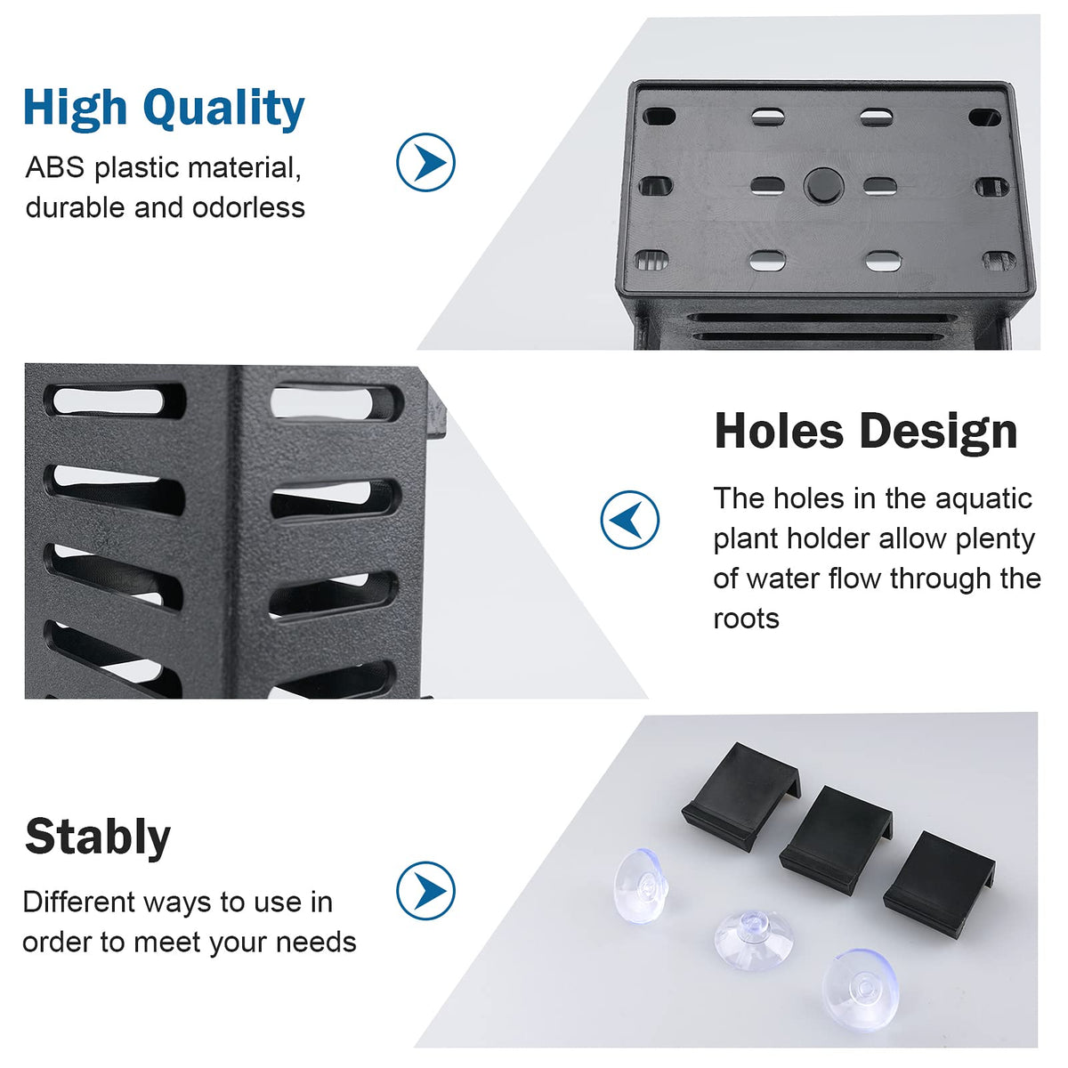 The aquarium plant holder has a creative and unique design, applied for planting or quickly propagating plants in aquariums and fish tanks, and can decorate your aquarium for a long time. Package Including: 4 PCS x Aquarium Plant Holder 24 PCS x Hooks 20 PCS x Suction Cups Two Ways to Use Hang the hooks stably on the glass edge of various aquariums or attach the suction cups to the aquarium glass. Holes Design The holes design can form a good internal circulation of aquarium water, and is perfect for growing aquatic plants in your aquarium. Convenient and Ornamental Just hanging them in aquariums and fish tanks, aquatic plants can multiply and grow rapidly in the holder, and it is a good way to create a good living environment for the fish.