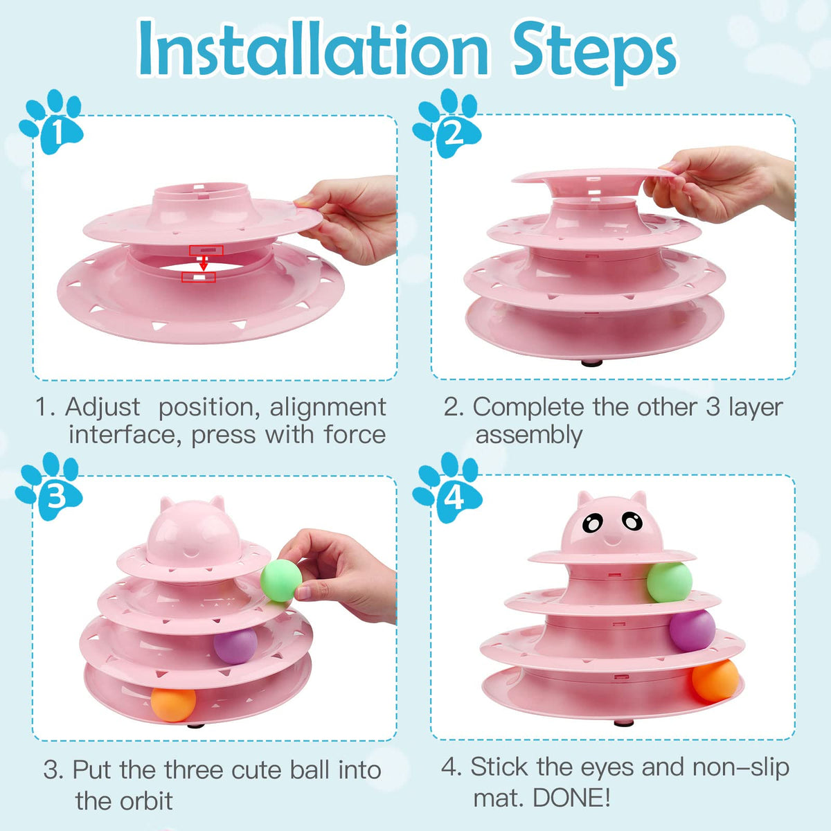 20 PcS Value Pack cat Toys: 20 pieces cat toys with cat toy roller cat teaser wand interactive feather toy mouse crinkle balls and etc This variety pack toy fits all cats needs keeping your kitten interesting Holiday and birthday special gifts for your cats High-Quality Toys: This cat roller toy is made of ultra-strong and tear-resistant PP that stands up to crazy cat scratcher antics a detachable multi-layer for easy cleanup with anti-slip mat to prevent product rollover So it is perfect for one or more cats Other interactive cat teaser toys are made from premium materials very durable and useful Keep Away Lonely: This turntable toy provides hours of exercise & self-amusement for health care and elimination of boredom and pet depression since your cat can play on its own when the master is not at home Encourages exercise through batting kicking pouncing fun with cat balls and a teaser wand give your cat a way to release his energy with this combo pack of entertaining toys Play Together: Two or more cats play with those toys together assorted cat chew toys with bright and vivid colors to engage your cats in solo or interactive chasing and swatting bringing a lot of fun for your pets which will make the cat happier and enhance each other friendship Detachable 4 Level: Multi-level durably turntable interactive cat toy with cute cat head shape on the top level Fun to entertain your cat for hours 3 plastic bell balls can be used interchangeably or played