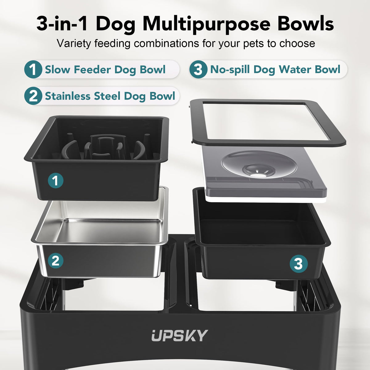 Upsky 3-In-1 Elevated Dog Bowls: Slow Feeder & No-Spill Stand, Stainless Steel, Adjustable Height For Small & Medium Dogs