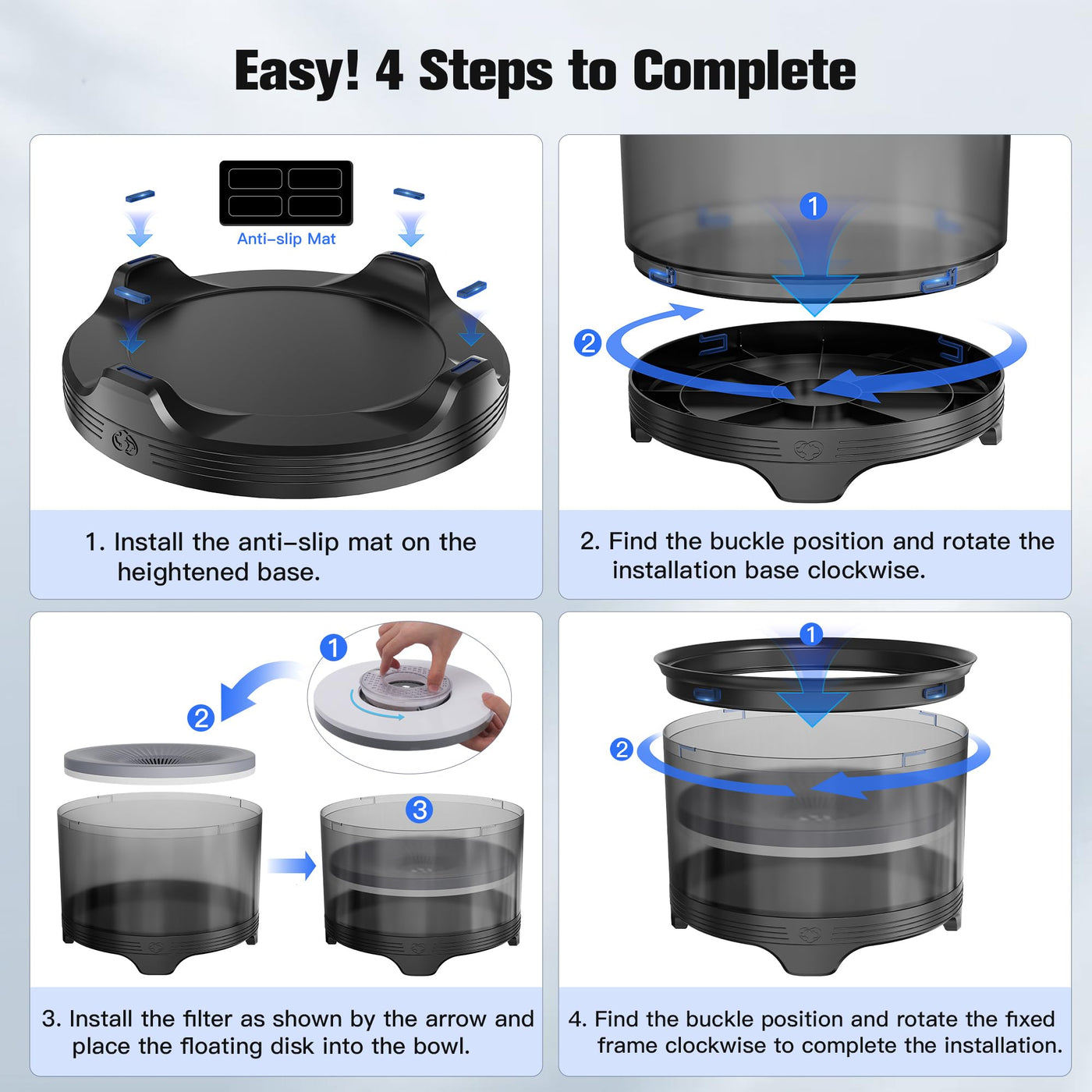 Anti-slip Dog Bowl Base: The base of the dog water dispenser is 1.8 inches. The appropriate height can encourage dogs to eat in a more natural posture and reduce pressure on the neck and throat. No spill water dog bowl base has 4 non-slip mats can effectively increase stability prevent the bowl from moving around easily and protect your floors.