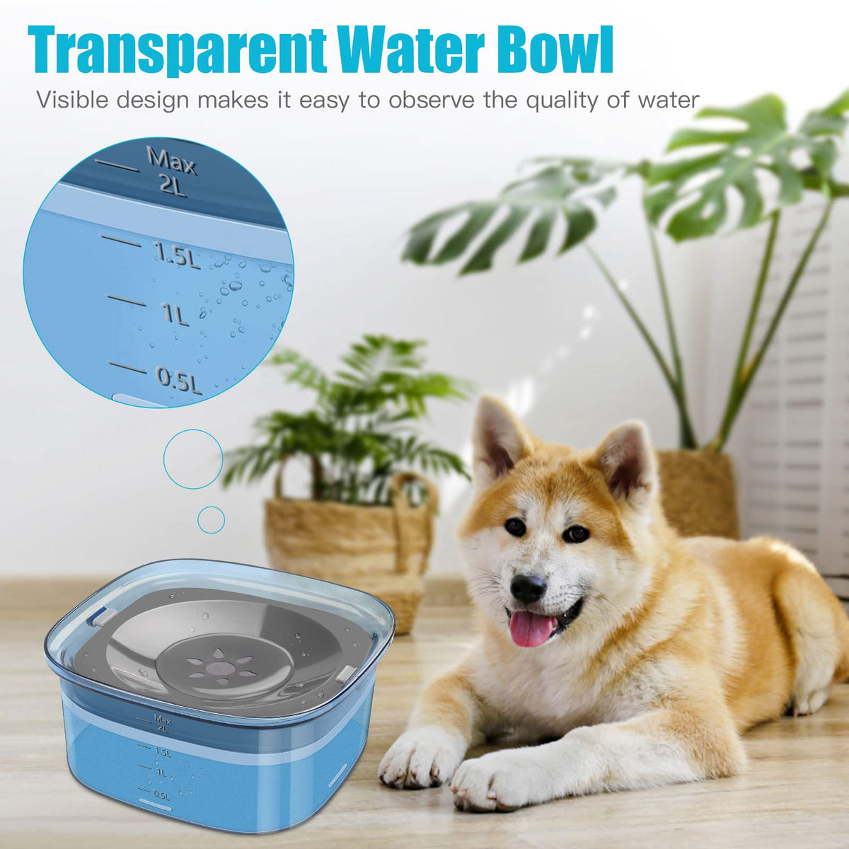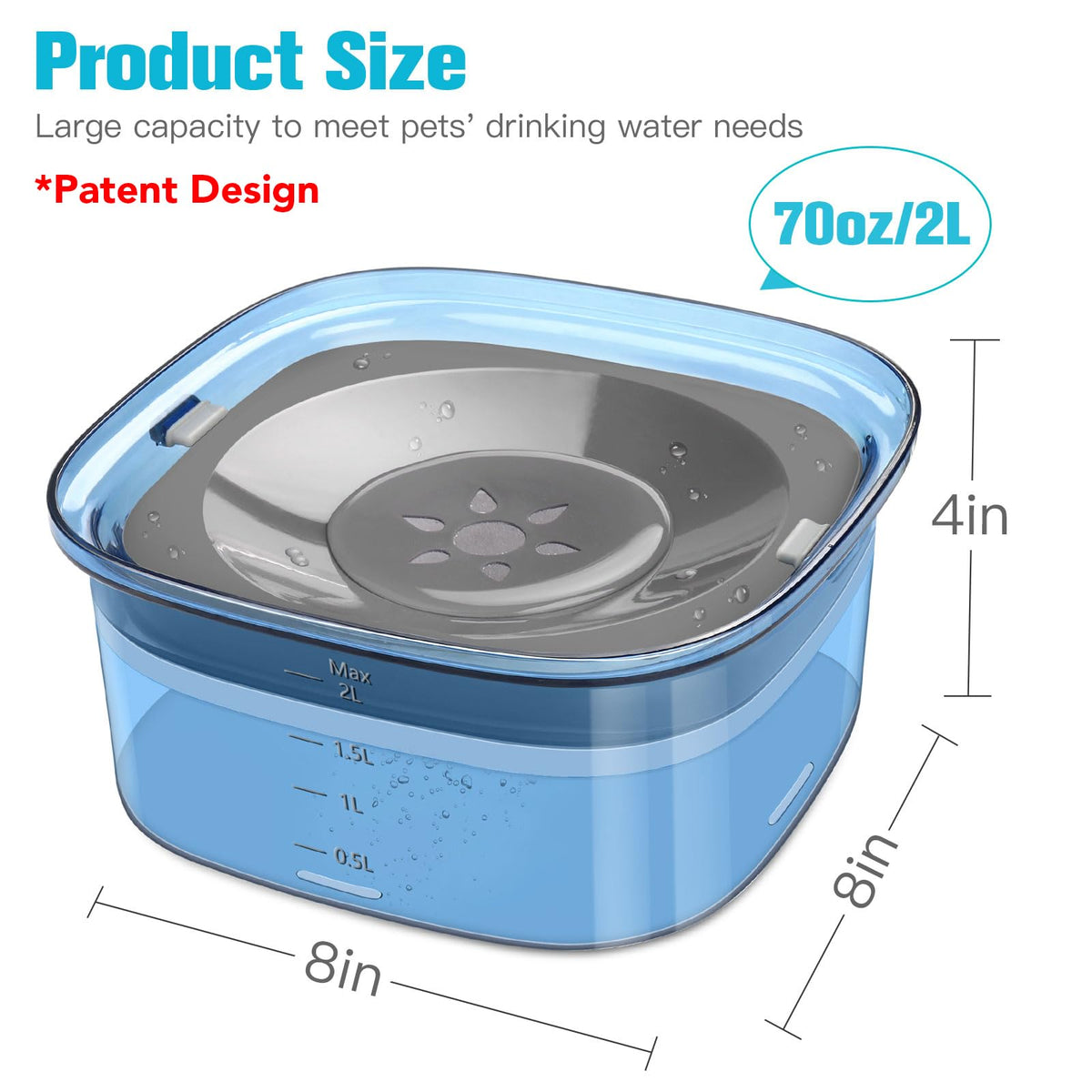 70oz2L Large capacity: Our dog water bowl is a patented design Holds a 70oz2L large capacity dog water bowl is great for dogs and multiple pet householdsA water needs no need to replenish the water frequently Keep your pets drinking enough water Innovative Diaphanous Design: The diaphanous water bowl is helpful to check the water quality and the water level reminder allows you to view how much water your pet drinks Making it easy to know when to change to clean water and grasp your pets water consumption Slow Water Feeder: The design of the automatic adjustable floating disk can slow down your pets drinking speed to avoid the wet mouth and prevent choking It also helps prevent the dust dirt and pet hair from falling into the water to provide your pet with clean water Anti-Spill & Anti-Slip: Widened bowl mouth floating disk and silicone plugs combine to effectively prevent water from spilling out and keep the floor clean The anti-slip bowl bottom helps prevent the floor from scratching Easy to clean: The floating disk can be disassembled for cleaning we recommend cleaning the floating disk at least twice a week Please note that after inserting the silicone fixing pads do not remove them easily to avoid loss