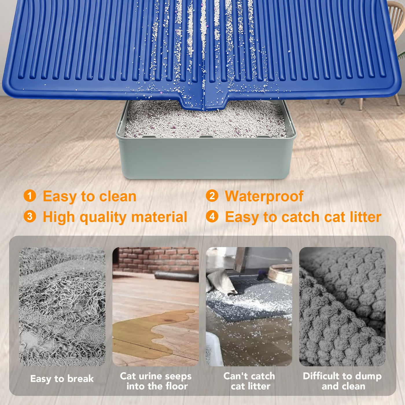 Waterproof Material: The raised edges of the cat litter mat prevent water or urine from seeping onto the floor protecting your floors and reducing cleaning accidents. The litter mat for cats will not absorb water and you can wipe it clean with a paper towel then rinse it with water and dry it before use.
