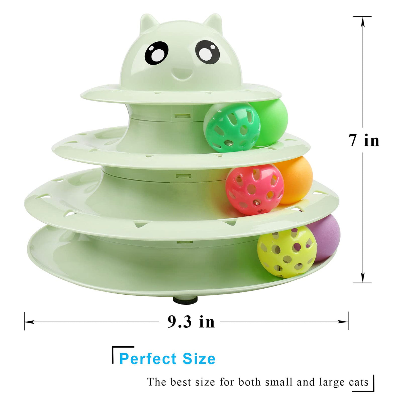 Stack & Sturdy construction: This cat toy is made of ultra-strong and tear-resistant PP that stands up to crazy cat scratcher antics a detachable multi-layer for easy cleanup with anti-slip mat to prevent product rollover So it is perfect for one or more cats Spinning Balls Keep cats Busy: The cat toy stimulates your catAs senses and hunting instincts this will increase their sensitivity and will not cause persecution on the furniture at home Keep Away Lonely: This toy provides hours of exercise & self-amusement for health care and elimination of boredom and pet depression since your cat can play on its own when the master is not at home Play Together: Two or more cats play with this toy together which will make the cat happier and enhance each other friendship Detachable 4 Level: Multi-level durably turntable interactive cat toy with cute cat head shape on the top level Fun to entertain your cat for hours