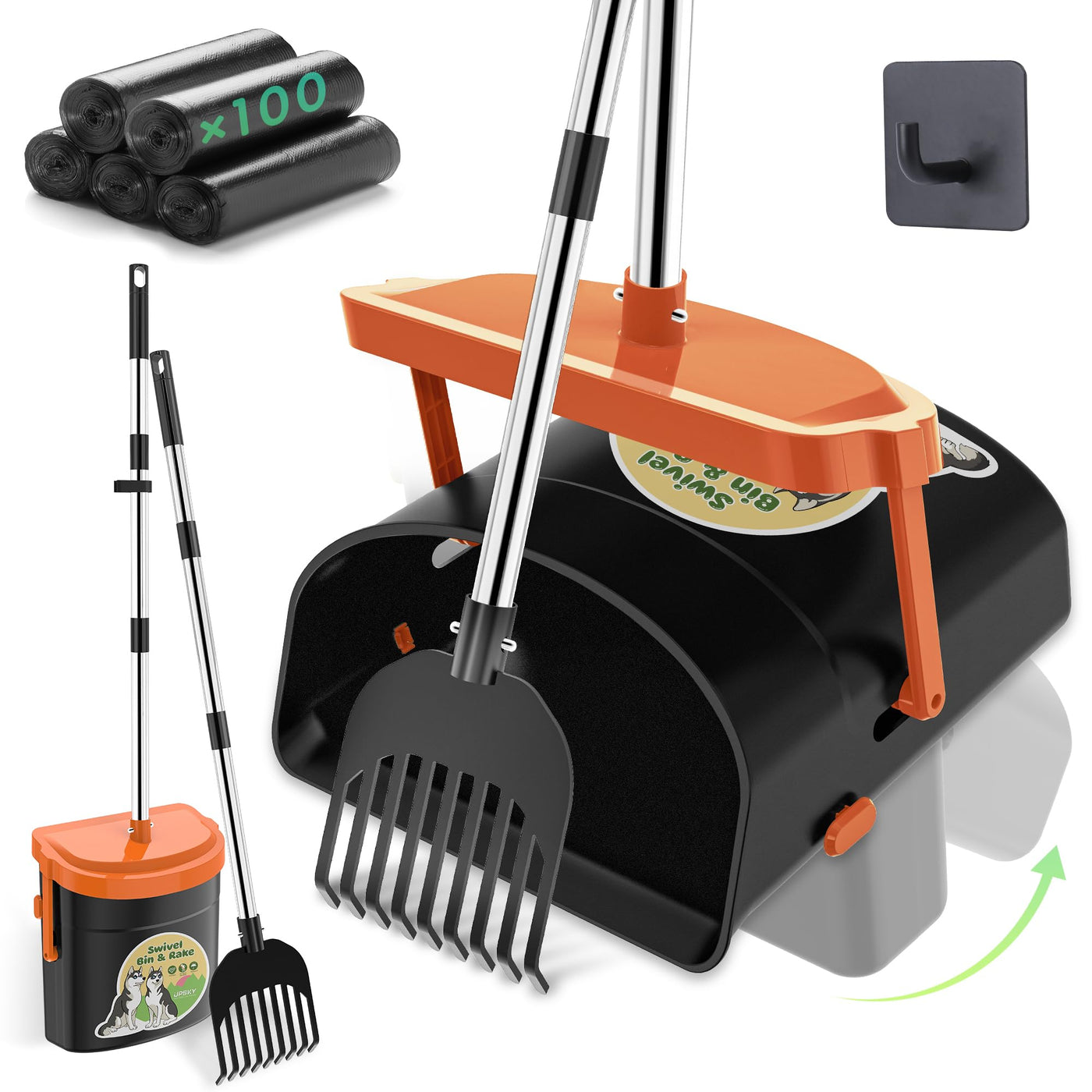 Upsky Dog Pooper Scooper Swivel Bin & Rake Kit With 100 Waste Bags,33.4' Stainless Steel Long Handle Heavy Duty Pet Poop Shovel
