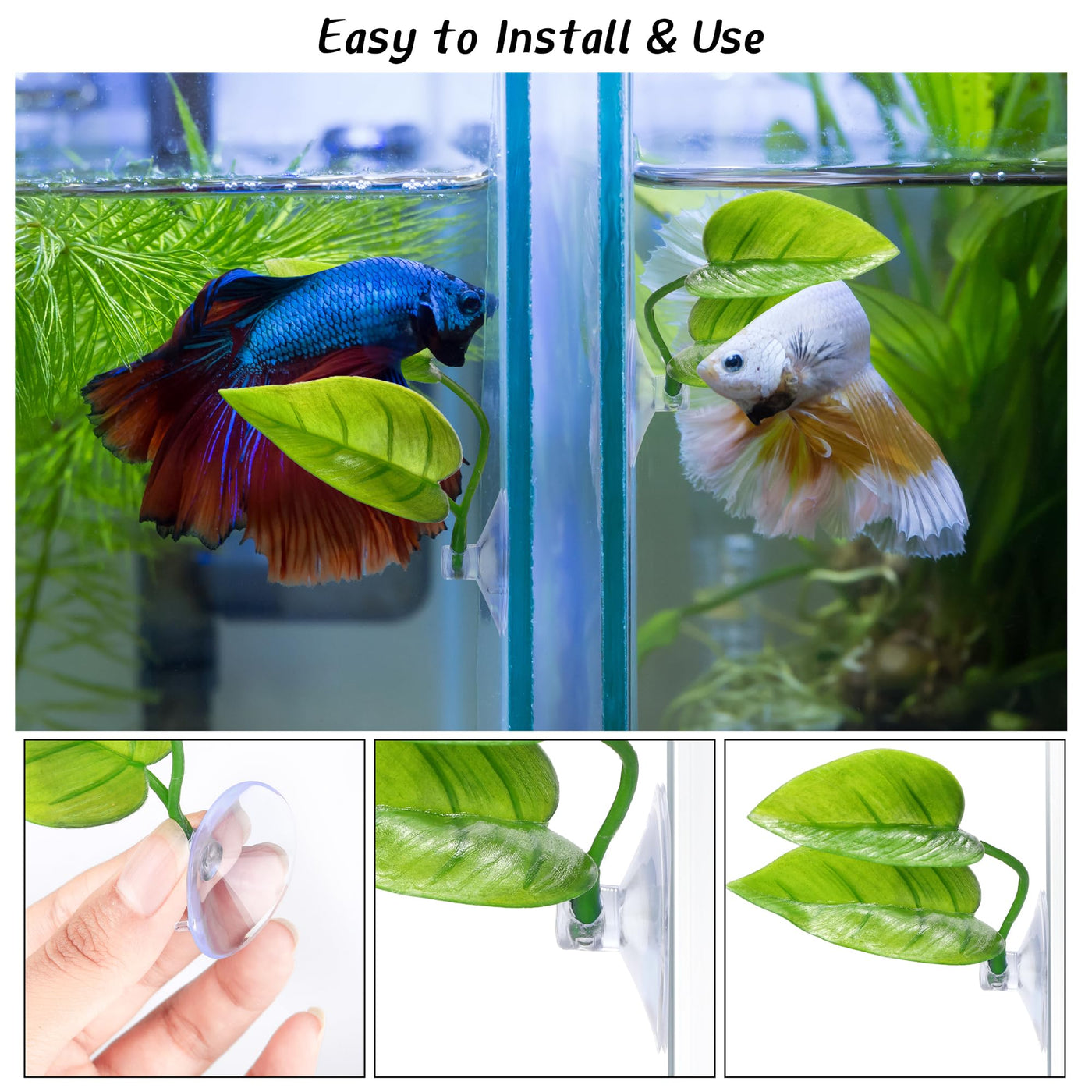 Package includes: 4 packs of betta fish leaf pads, each leaf pad contains 2 pieces of leaves are in different sizes, the big leave is about 2.36 x 1.77 inches, the small leave is about 1.97 x 1.5 inches, enough for your use | Material: the betta fish leaf pad is made of high quality plastic material, light, durable, safe, colorfast and vivid that could simulate the outdoor living environment of betta fishes | Design: there is a suction cup with strong suction above the betta fish leaf pad, convenient for you to fix the leaf pad on the glass, so you don t worry the pad will fall off; and the leaves will sway with the waves | When using it, please fix the leaf pad at 3/4 of the fish tank to establish a resting place for bettas; you need to relocate if you find that bettas are not under the leaf pad | Application: the leaf pad is suitable for betta fish, tetra, guppy, gourami, platies, molly to build nests and spawn; please build the nice home for your pet