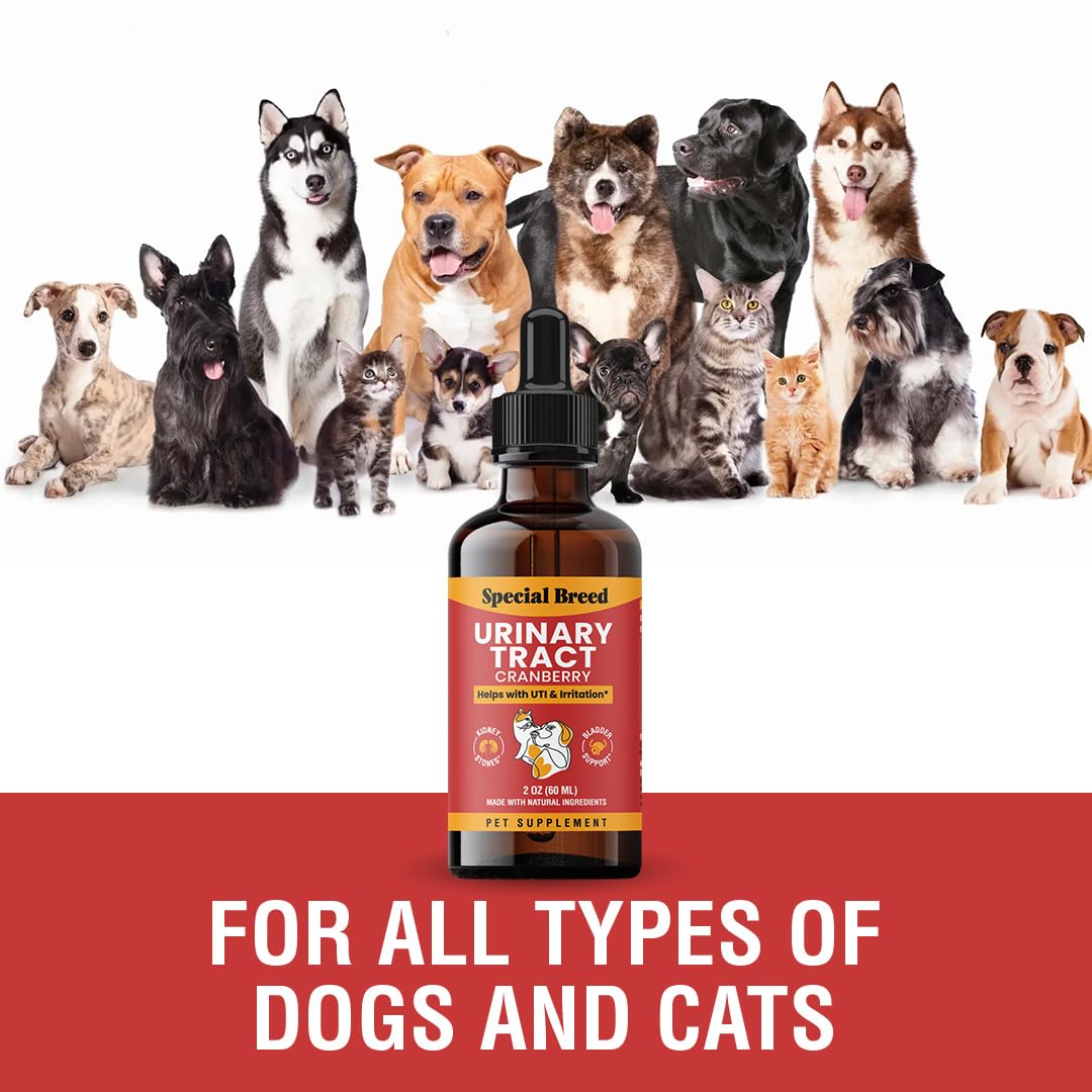 Introducing Special Breed Urinary Tract Infection Treatment for Dogs and Cats, a natural solution for your pets kidney and bladder health. Our cranberry UTI supplement in a convenient 2 oz size provides effective support for urinary tract issues. Quality is our priority. This USA-made supplement is crafted with care to ensure maximum efficacy. Produced in a GMP-certified facility, each batch meets the highest standards of safety and reliability, giving you peace of mind. Choose Special Breed for a healthier pet. Our commitment to natural ingredients and quality manufacturing ensures your furry friend receives the best care. Support their urinary health with this trusted and effective supplement.