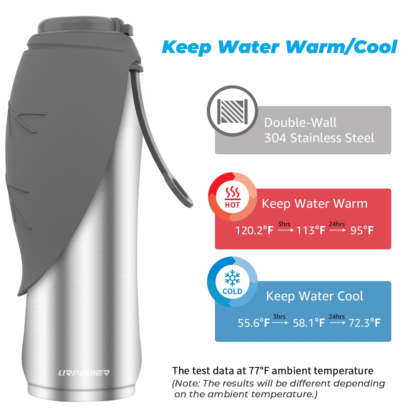 Urpower 27Oz Double Wall Insulated Stainless Steel Portable Dog Water Bottle Keep Water Warm/Cool The Double-Wall Insulated Dog Water Bottle Keeps Water Warm Or Cool For Hours. Vacuum Insulation Prevents Water From Freezing And Makes Water Available For Pets In Extremely Cold Winter. It Says Goodbye To Sweating And Provides Your Dogs With Cool Water In Hot Summer. Stainless Steel & Bpa Free The Dog Travel Water Bottle Is Made Of 304 Stainless Steel Bottle, Bpa Free Plastic Lid And Silicone Bowl. It Is Durable Enough To Last For Years, And Is Safe To Keep Your Dogs Hydrated And Happy When Adventuring With You. Extra-Wide Drinking Bowl The Leaf-Shaped Silicone Flips Easily Into A Large Drinking Bowl, And Is Wider Than Others Hard Plastic Lids. The 27Oz Large Dog Water Dispenser Works Great For Dogs Of Any Size And Breed. Portable It Can Quickly Release Or Return The Water, No Squeezing And No Extra Bowl Required. The Portable Pet Water Bottle Is Easy To Carry By Handle When You Take Your Dog For A Walk.