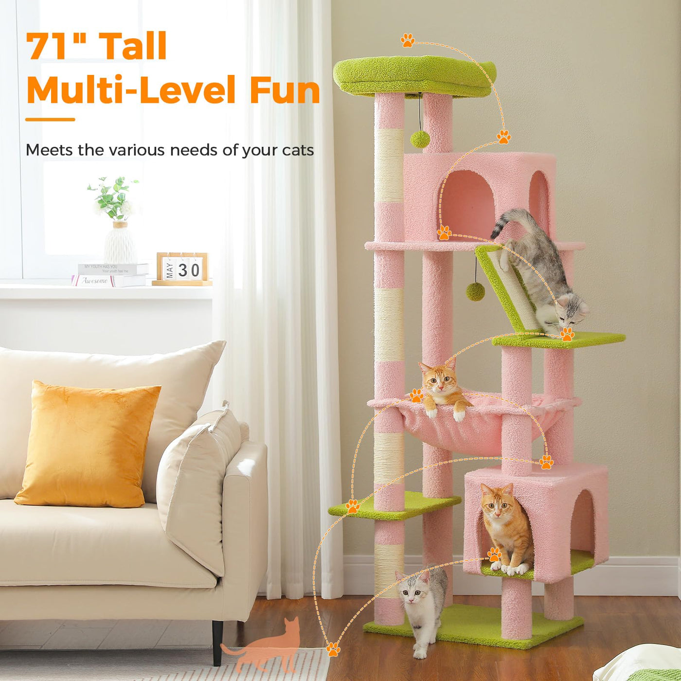 About Us: This Modern Uymi Cat Tree Will Be Stable Enough For Your Energetic Cat, And Fun Enough For Your Adorable Kitten. Step-Like Jump Multi-Level Design Not Only Provides More Activity Centers But Also Allows Your Kittens To Climb This Cat Tree More Easily. &Nbsp; &Nbsp; The Quiet And Roomy Condo Is Ready For Your Cat To Have A Private Nap; An Extra-Large Top Perch With Raised Edge Offers More Safety And Support For Your Cat; The Hanging Scratching Rope And The Dangling Hammock Provide Your Feline Additional Fun; &Nbsp; &Nbsp; Combing With Several Resting Platforms As Well As Strategically Placed Scratching Posts, This Cat Tower Creates An Enticing World For Curious Cats. Solid Construction With A Balanced Design And A Strong Base Ensures Your Fur Babies Are Safe When Playing On This Cat Tree. The Light Grey Color Will Also Match The Furniture Of Your Room. Your Pets Will Enjoy A Lot On This New Castle! [Overall Dimensions] [Length]: 55Cm=21.6 [Width ]: 45Cm=17.7 [Height]: 181Cm=71.3 [Weight]: 16.5Kg=36.3Lbs [Specifications] 1X Cat Tree 1X Installation Manual 1X Spare Pompom 1X Set Of Tools And Parts [1 Year Warranty] 100% Customer Service Satisfied Guarantee! If You Have Any Issues With Uymi Products, Please Contact Us First, Then We Will Make It Right, And See Your Smile Again. [Innovation]: Rst = Replaceable Screw Toy, Cats Can Enjoy Them Their Whole Life Cats Love Dangling Toys,&Nbsp; Hunting Them Catching Them, And Biting Them. Mostly, The Toy'S Lifetime Is About 1-3 Months, Maybe Only A Few Days In Aggressive Cats. The Innovation: We Re-Design The Toy With A Replaceable Screw, So You Can Easily Change It With A New Dangling Ball, And We Gift With 1 Extra Toy Ball, And Of Course, You Can Buy More From Uymi