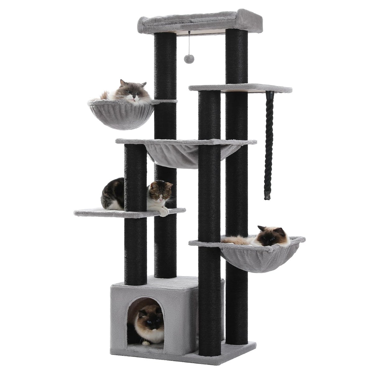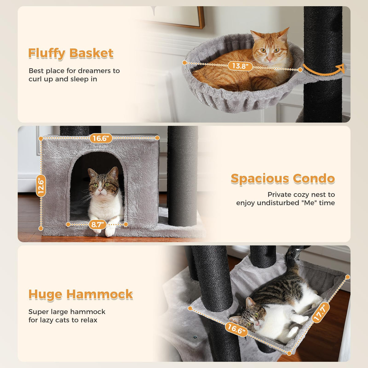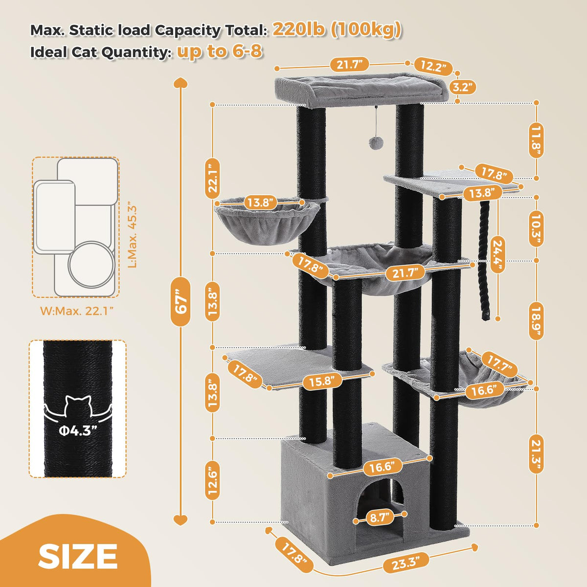 About Us: This Uymi Heavy Duty Cat Tree Is Designed For Large Cats And Can Accommodate 5-6 Large Cats To Play At The Same Time, Which Is Very Suitable For Multi-Cat Families. Stable Enough For Energetic Cats And Fun Enough For Cute Kittens. The Quiet And Spacious Apartment Provides A Private Nap For Your Cat; The Oversized Top Perch With Padding Provides Your Cat With A High View; The Extra-Large Hammock And 2 Round Baskets Are Suitable For Your Cat To Have A Cozy Nap And Rest, And The Dangling Ball And The Thick Long Play Rope Provide Extra Fun For Your Cat; Combined With Multiple Resting Platforms And Extra Thick Natural Sisal Scratching Posts, This Cat Tower Creates An Adventurous Paradise For Curious Cats. The Sturdy Construction, Balanced Design And 1.6 Thickened Double-Layer Base Ensure Your Furry Baby Is Safe When Playing On This Cat Tree. [Features] [Color]: Black, Beige, Pink [Length]: 115Cm=45.3 [Width]: 56Cm=22.1 [Height]: 170Cm=67 [Weight]: 9.08Kg=20.02Lbs [Specifications] 1X Cat Tree 1X Installation Manual 1X Spare Pom Poms 1X Tools And Parts Set Max. Static Load Capacity Total: 220 Lb (99.7 Kg) [1 Year Warranty] 100% Customer Service Satisfaction Guarantee! If You Have Any Problems With Uymi Products, Please Contact Us First, Then We Will Solve The Problem And See Your Smile Again. Uymi Notes: For The Safety Of Your Furry Friend, We Recommend Using The Included Anti-Tip Chain To Secure The Cat Tree To The Wall, Preventing Wobbling Or Tipping During Active Play. If Any Part Of The Cat Tree Gets Scratched Or Damaged By Playful Paws, Please Repair Or Replace It Promptly To Avoid Any Potential Injury To Your Pet. Should You Need Any Replacement Parts Or Additional Accessories, You Can Easily Purchase Them Directly From Our Store. Your Cats Safety And Comfort Are Our Top Priority, And Were Always Here To Help!