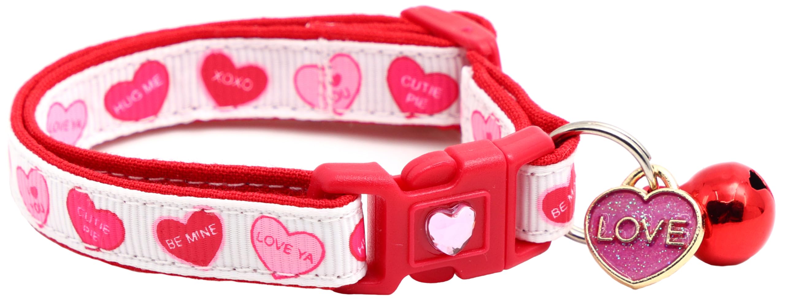 Valentines Day Cat Collar With Bell | Safety Breakaway Collar | Adjustable Large Size Or Kitten Collar (Red Conversation Hearts,