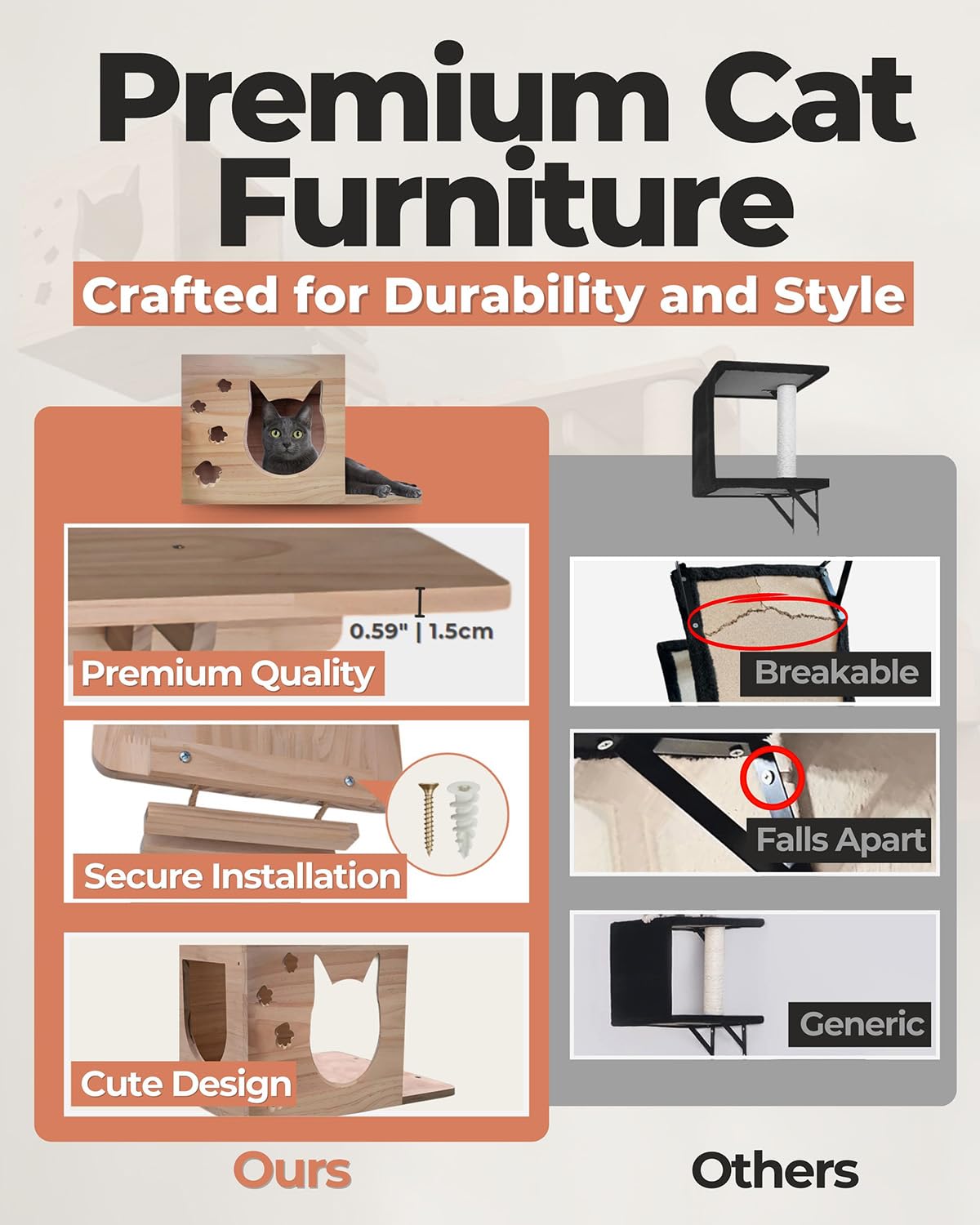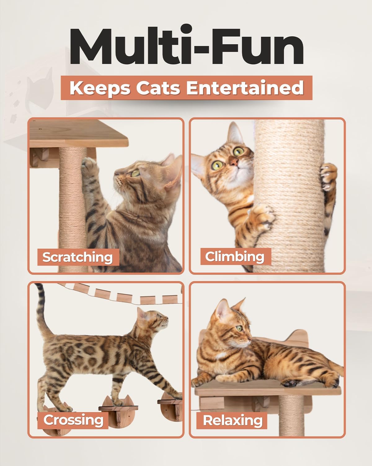Vantix Plus Cat Wall Shelves | Pine Wooden Wall Mounted Cat Furniture, Set Of 8, Cute Perch, Shelves, Scratching Posts, Steps An