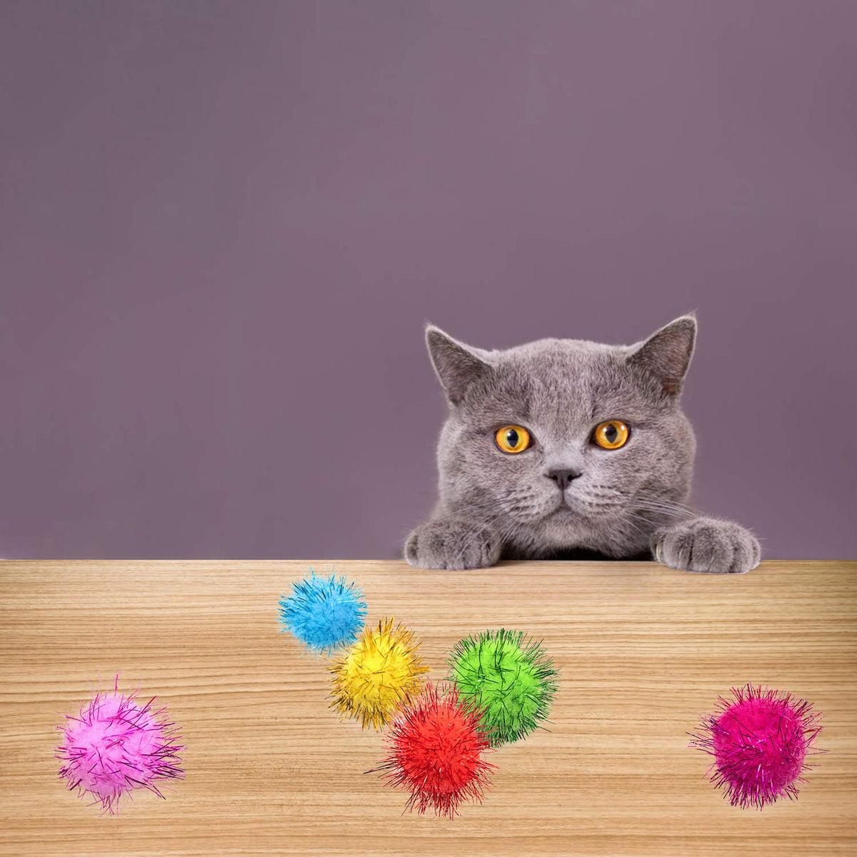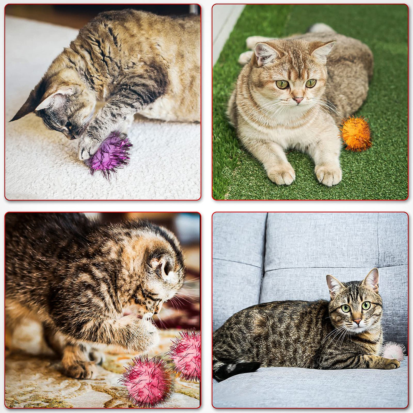 Package Includes:30 pcs red color sparkle tinsel poms Size:About 1.3' (dia),about 1.5' including the sparkle tinsel These are entertainment for cats and kittens,An easy way to keep your cat amused. Warning: Choking hazard-small parts