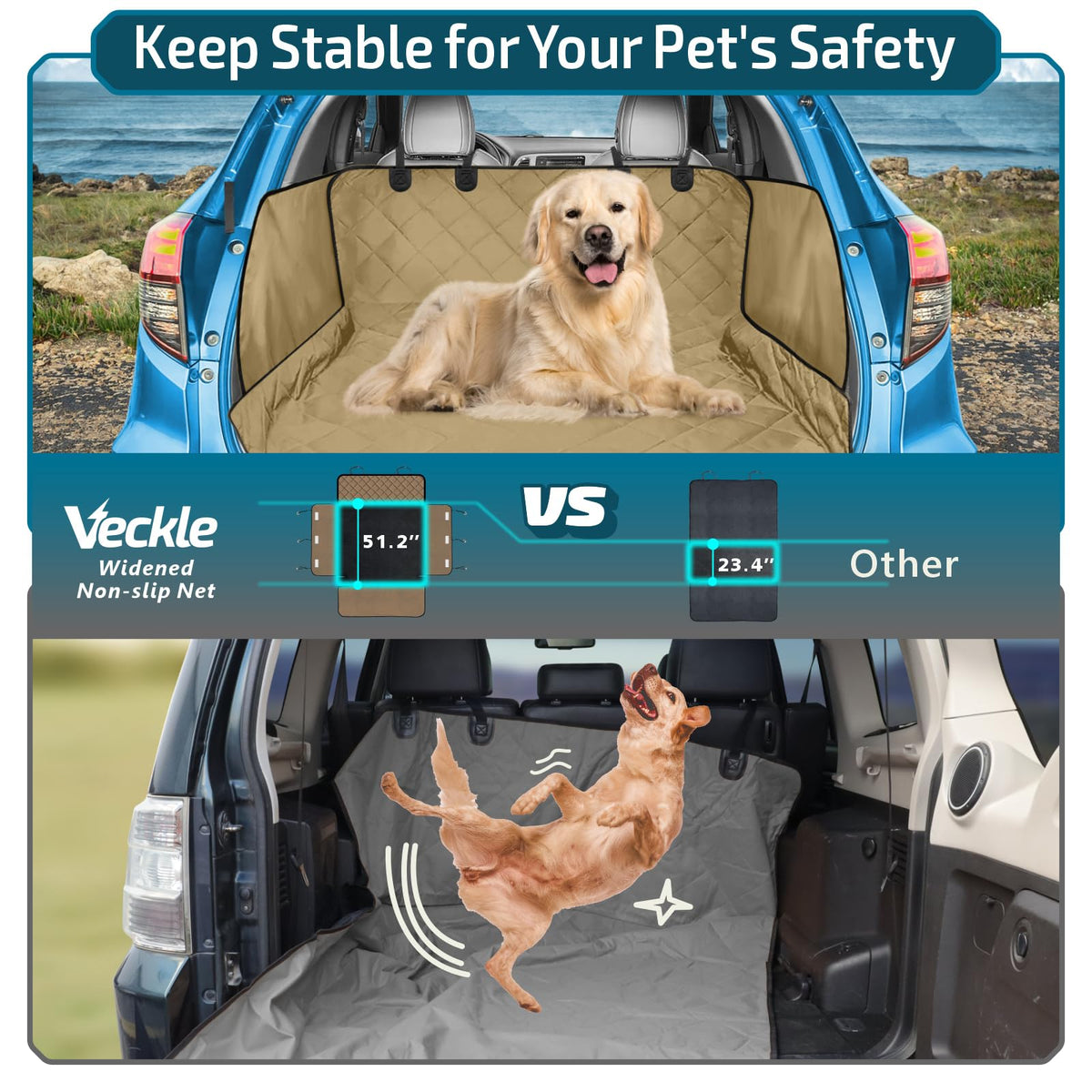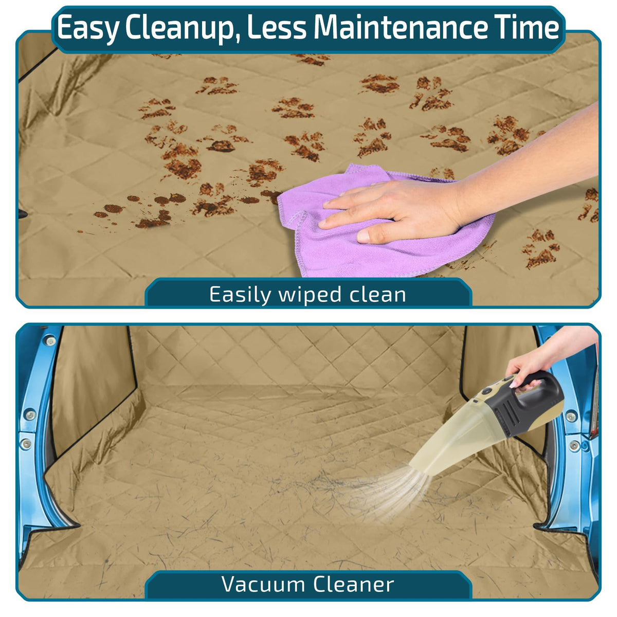 Q: Is the Veckle Cargo Liner waterproof and durable?A: Yes, the Veckle Cargo Liner is made from wear-resistant 600D Oxford cloth with a PVC water-resistant coating. This combination ensures durability against spills, dirt, pet fur, and claws, making it an excellent protector for your cargo area.