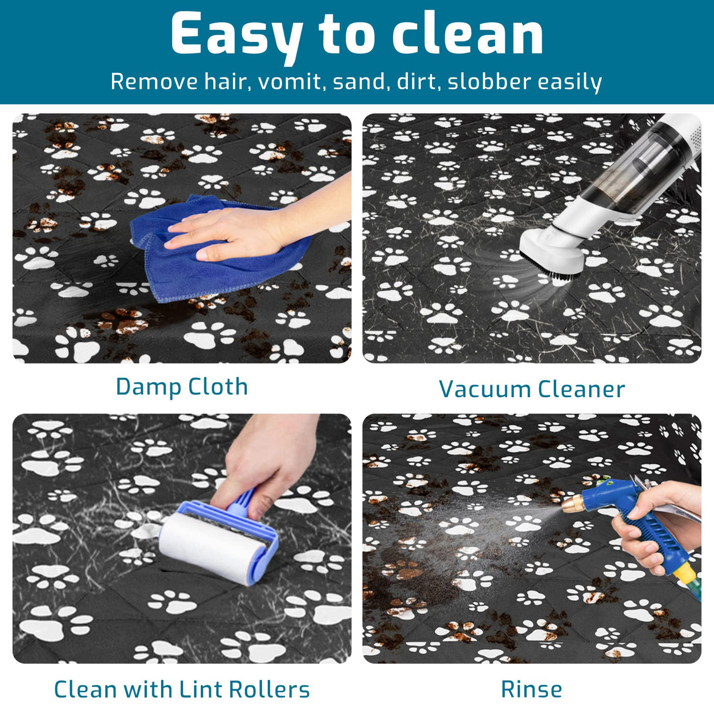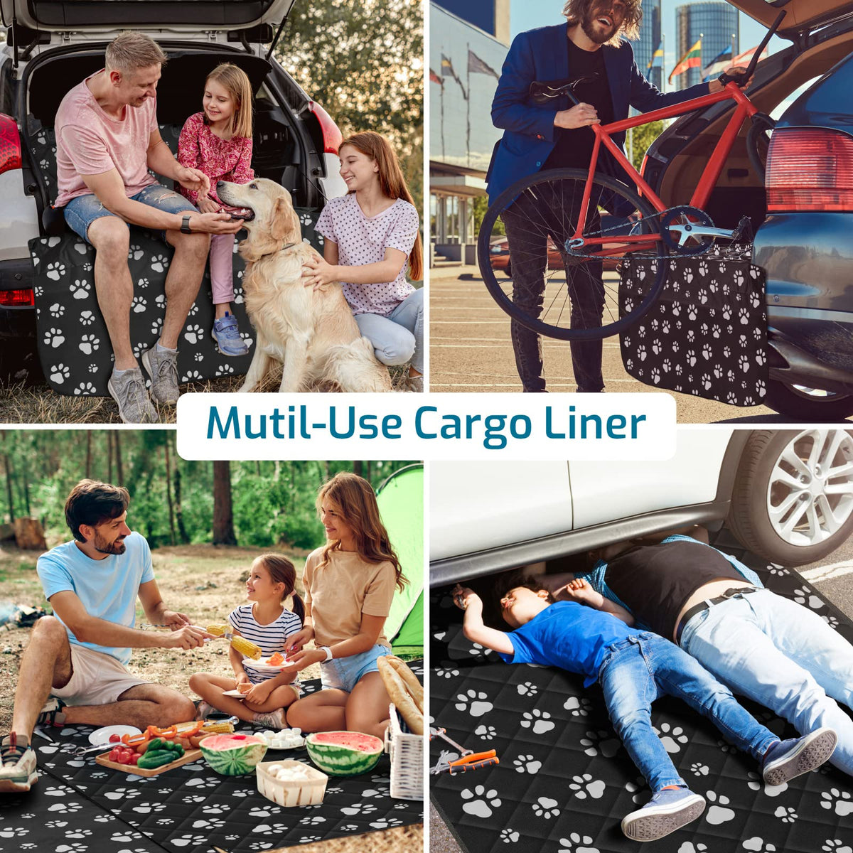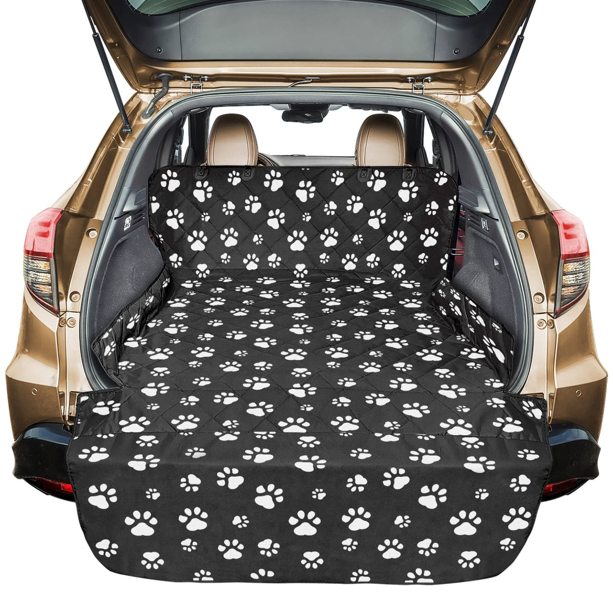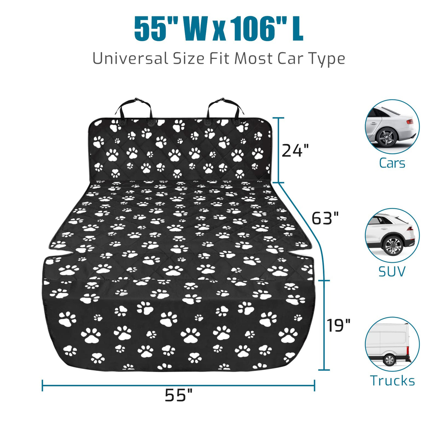 Perfectly Fit Size 55*106 inch SUV cargo cover is for pet dogs, goods or luggage, extra large mat fits for almost all Standard Vehicles; Please check for the size of your car Widened non-slip net SUV dog cargo mat has a large range of, about 54*47 inch non-slip net as base for more frition to enhance stability, worry-free for quick turns and speed bumps Durable Water Resistant Pet Cargo Rider Made of wear-resistant 600D Oxford cloth and PVC water-resistant coating with enhanced stitching on the handle of this dog seat car cover, it would be more durable and tear resistant and it protects your car cargo area from dirt, spills, pet fur and claws Easy to Install and Use Just snap the buckle straps around your car 's headrests and tuck the soft seat anchors in the back seat to fix the dog cargo liner protector