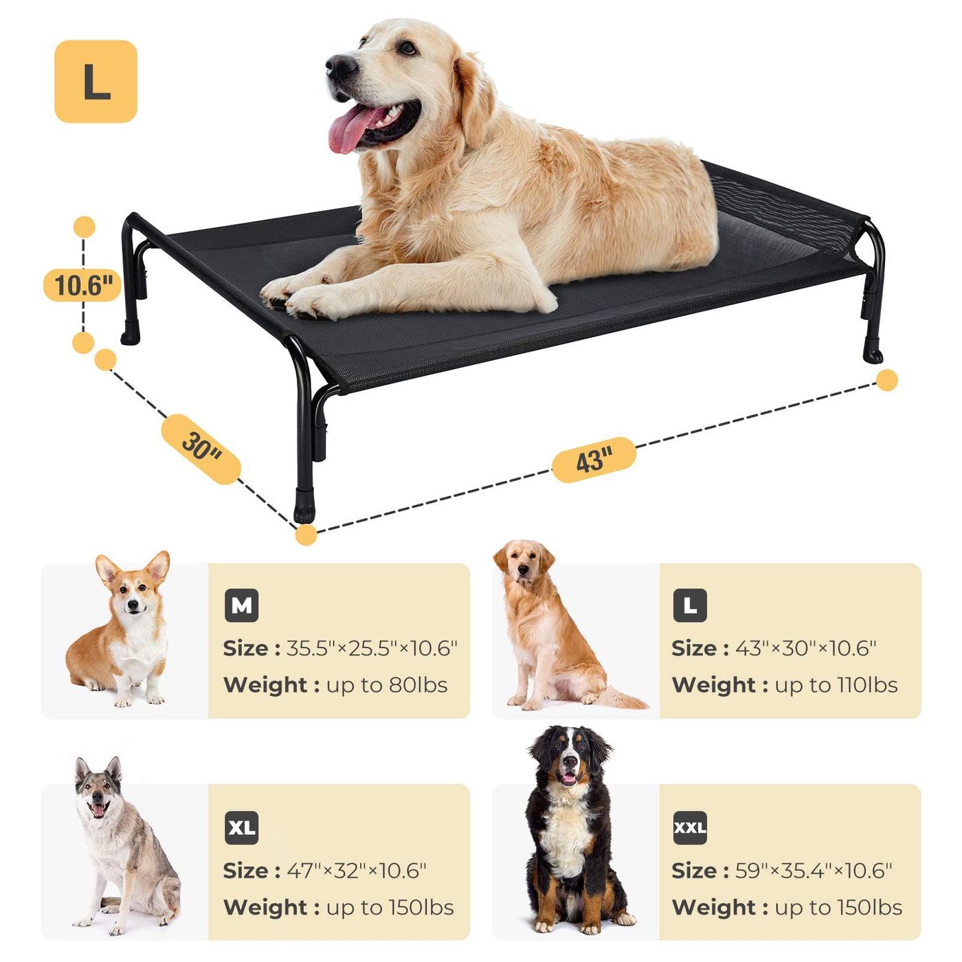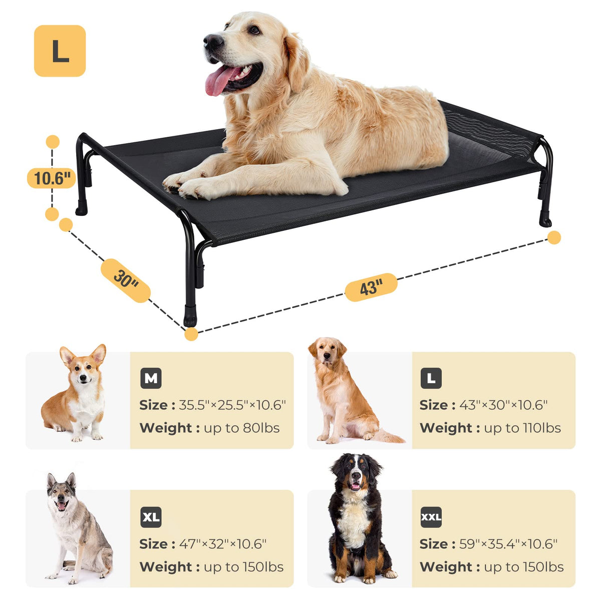 Veehoo Elevated Dog Bed, Outdoor Raised Dog Cots Bed For Large Dogs, Cooling Camping Elevated Pet Bed With Slope Headrest For Indoor And Outdoor, Washable Breathable, Large, Black, Cwc2204