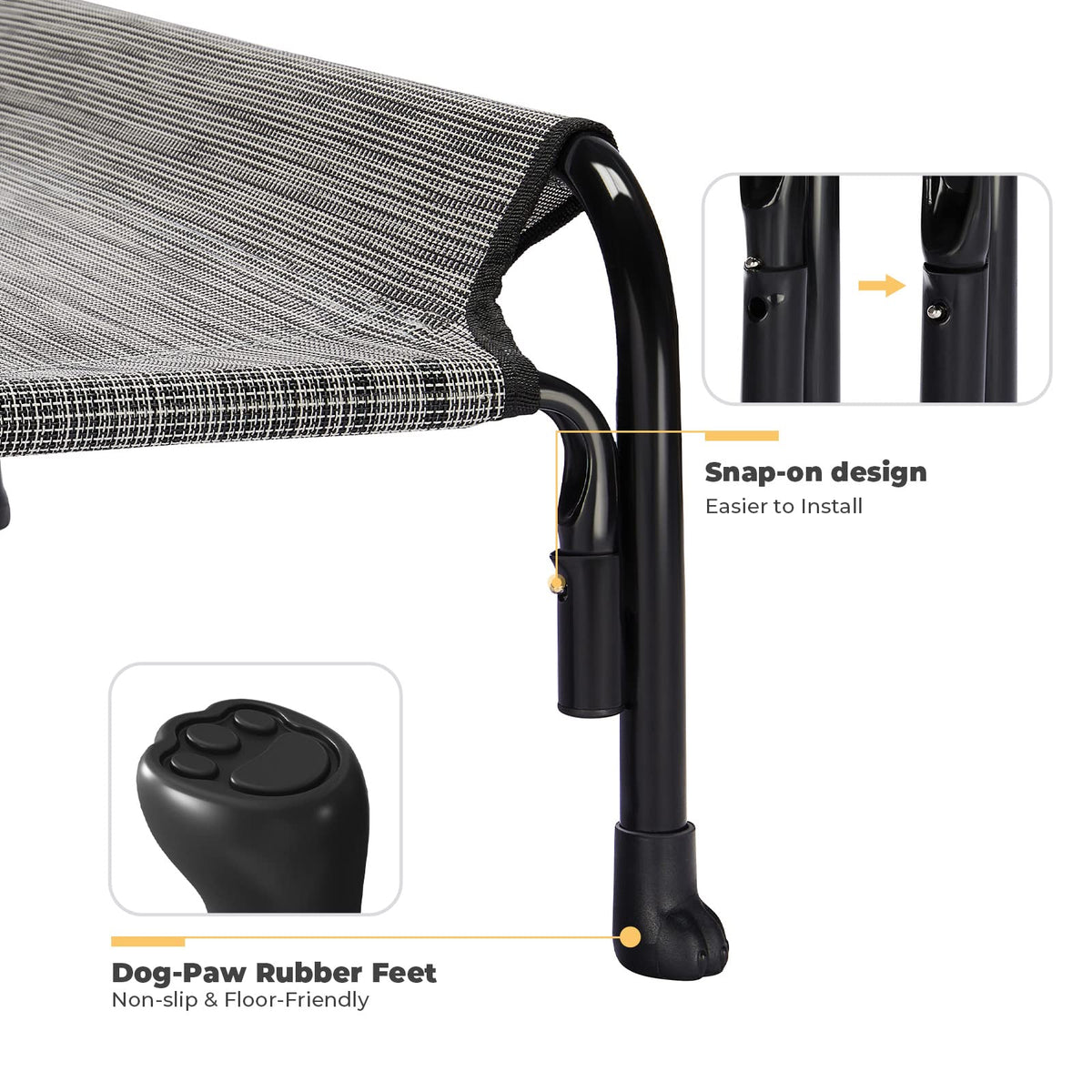 Powder-Coated Steel: 1, Snap-on design for easier installation. 2, Non-Slip Rubber feet keep the pet bed from sliding. 3, Design of connecting lines between pipes.