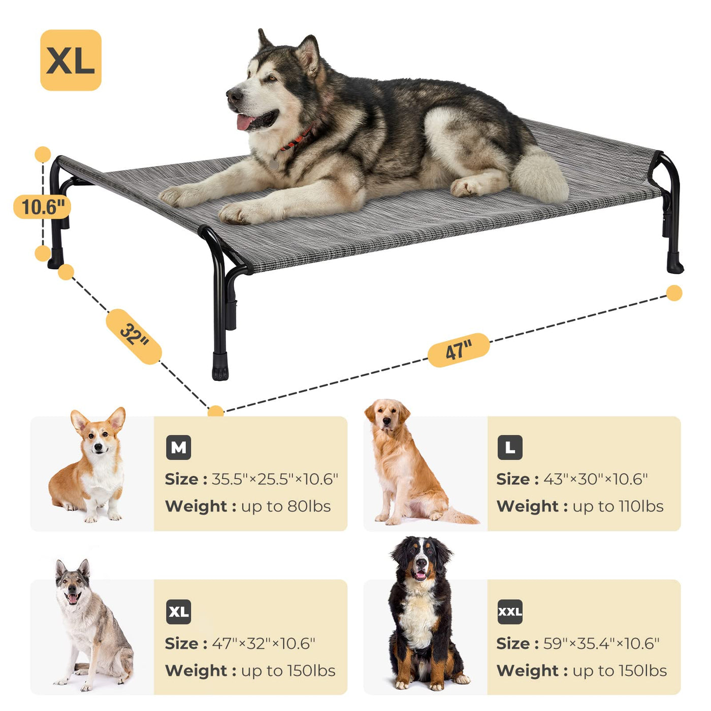 Q: What is the weight capacity of the Veehoo Elevated Dog Bed?A: The Veehoo Elevated Dog Bed is designed to support pets weighing up to 150 lbs for the X-Large size, making it suitable for larger breeds like Golden Retrievers, Rottweilers, and Dobermans.