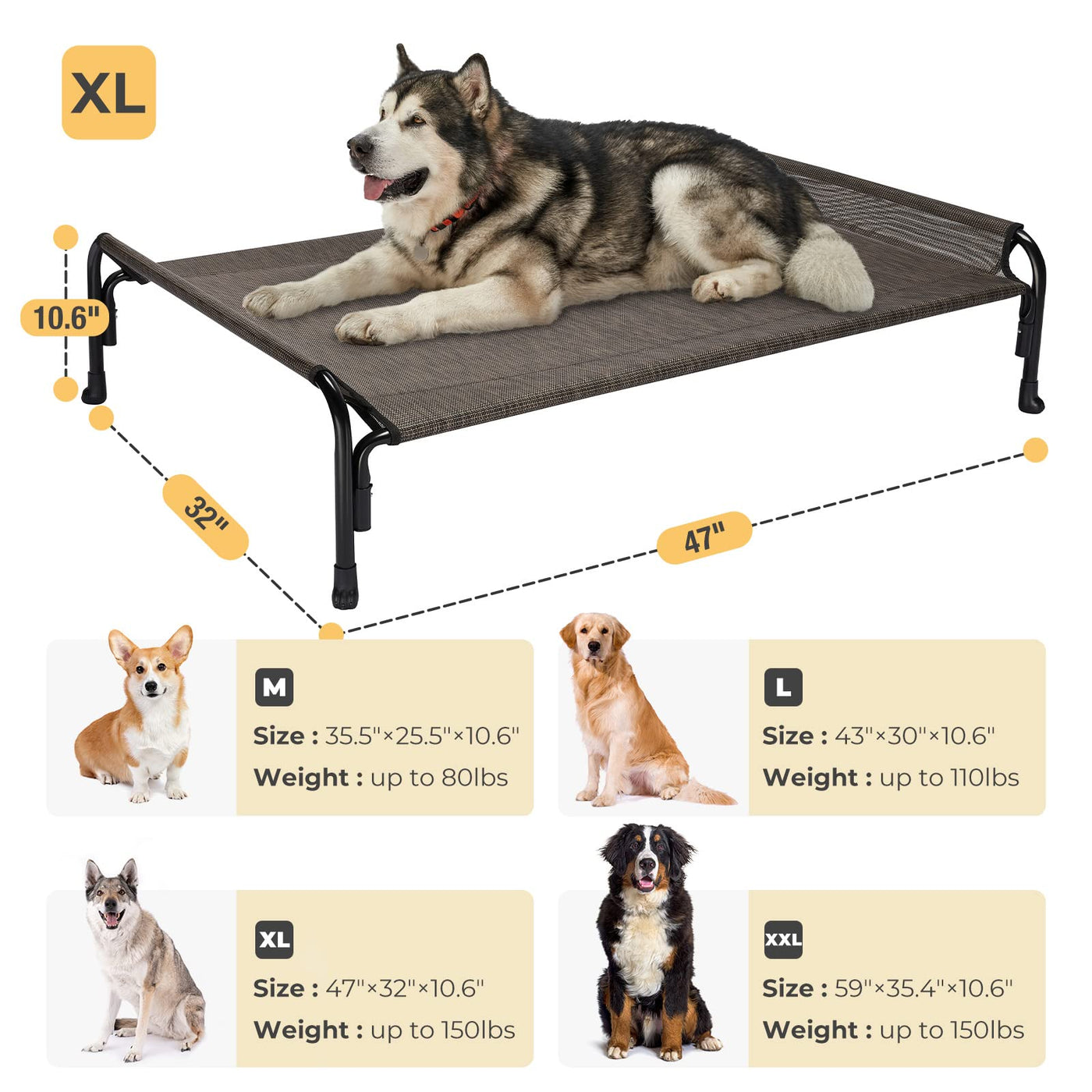 Q: What sizes are available for the Veehoo Elevated Dog Bed?A: The Veehoo Elevated Dog Bed comes in three sizes: Medium (35.5" x 25.5" x 10.6", supports up to 80 lbs), Large (43" x 30" x 10.6", supports up to 110 lbs), and X-Large (47" x 32" x 10.6", supports up to 150 lbs). This range ensures you can find the perfect fit for your dog.