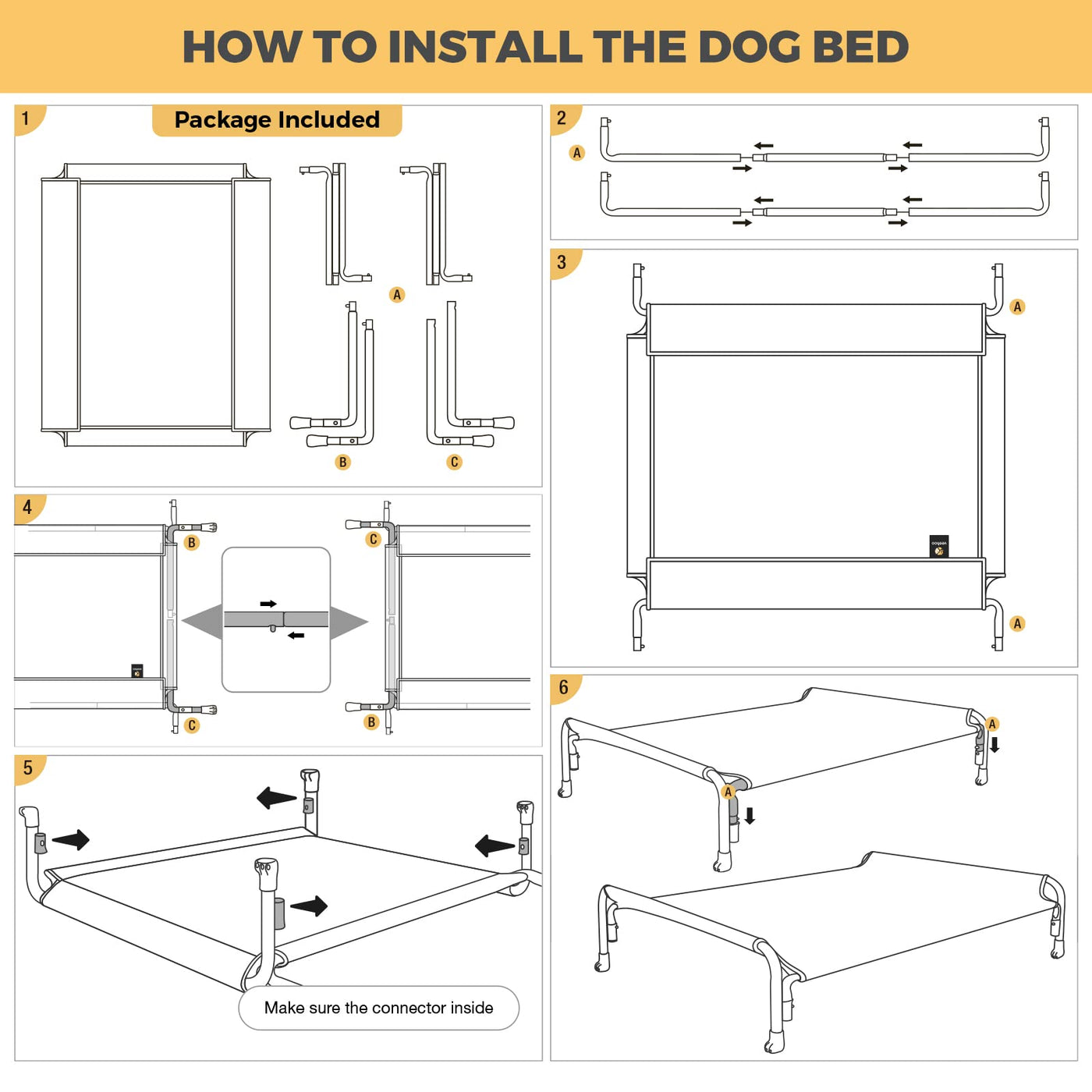 Powder-Coated Steel: 1, Snap-on design for easier installation. 2, Non-Slip Rubber feet keep the pet bed from sliding. 3, Design of connecting lines between pipes.