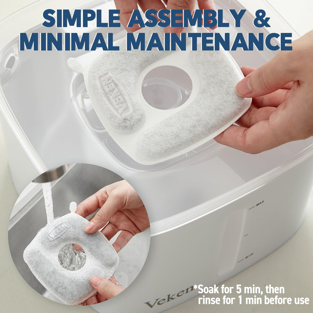 Ensures Clean, Fresh Water: Encased in high-density fabric, our multi-stage filtration features silver and coconut shell activated carbon, along with a unique composite scale inhibitor, to provide your pets with clean, fresh, and great-tasting water. | Tailored for Veken: Authentic Veken filters are meticulously designed to fit snugly into your 67oz, 95oz, or 135oz fountain. Each filter is individually sealed for integrity, making Veken the only correct choice for your filtration needs. | Superior Filtration Performance: Our refined coconut shell activated carbon boasts an advanced pore structure that outperforms standard activated carbon. It absorbs impurities rapidly, lasts longer, and excels at filtering contaminants from water. | Cost-Effective and Durable: Keep your pets thriving and hydrated without breaking the bank. Our authentic Veken pet fountain filters offer exceptional longevity and value for a minimal monthly investment, thanks to their enduring design. | Convenient Multipack Bundle: Our filter replacement pack includes both filters and pre-filter sponges, making maintenance a breeze. Easily swap out both filters during your regular fountain cleaning to ensure consistently fresh water for your pets.