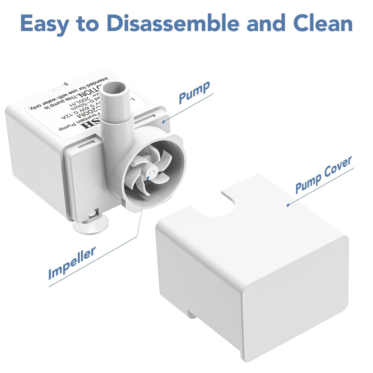 Clean the pump is essential to the longevity of the fountain. Clean the pump every 2 weeks. 1.Remove the pump cover. 2.Remove the impeller and clean the parts with soap and warm water.