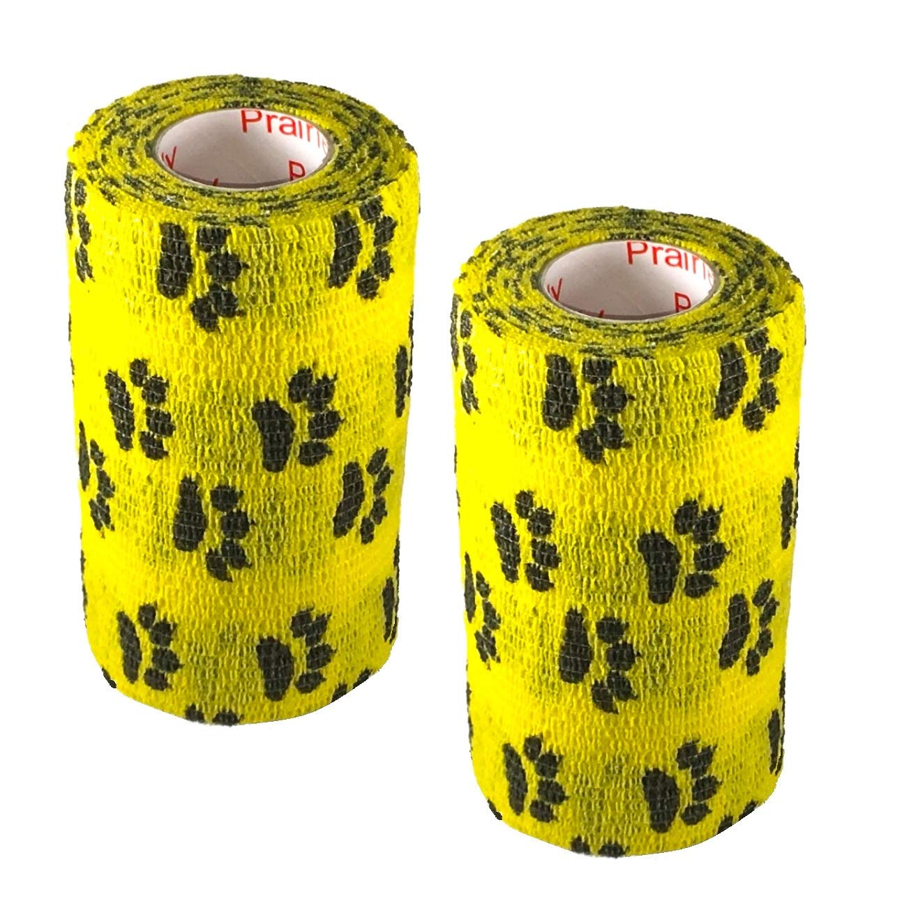 Vet Wrap Wrap Tape (Yellow with Paw Prints) (2 Pack) (3 Inch x 15 feet) Self Adhesive Adherent Adhering Cohesive Flex Self Stick