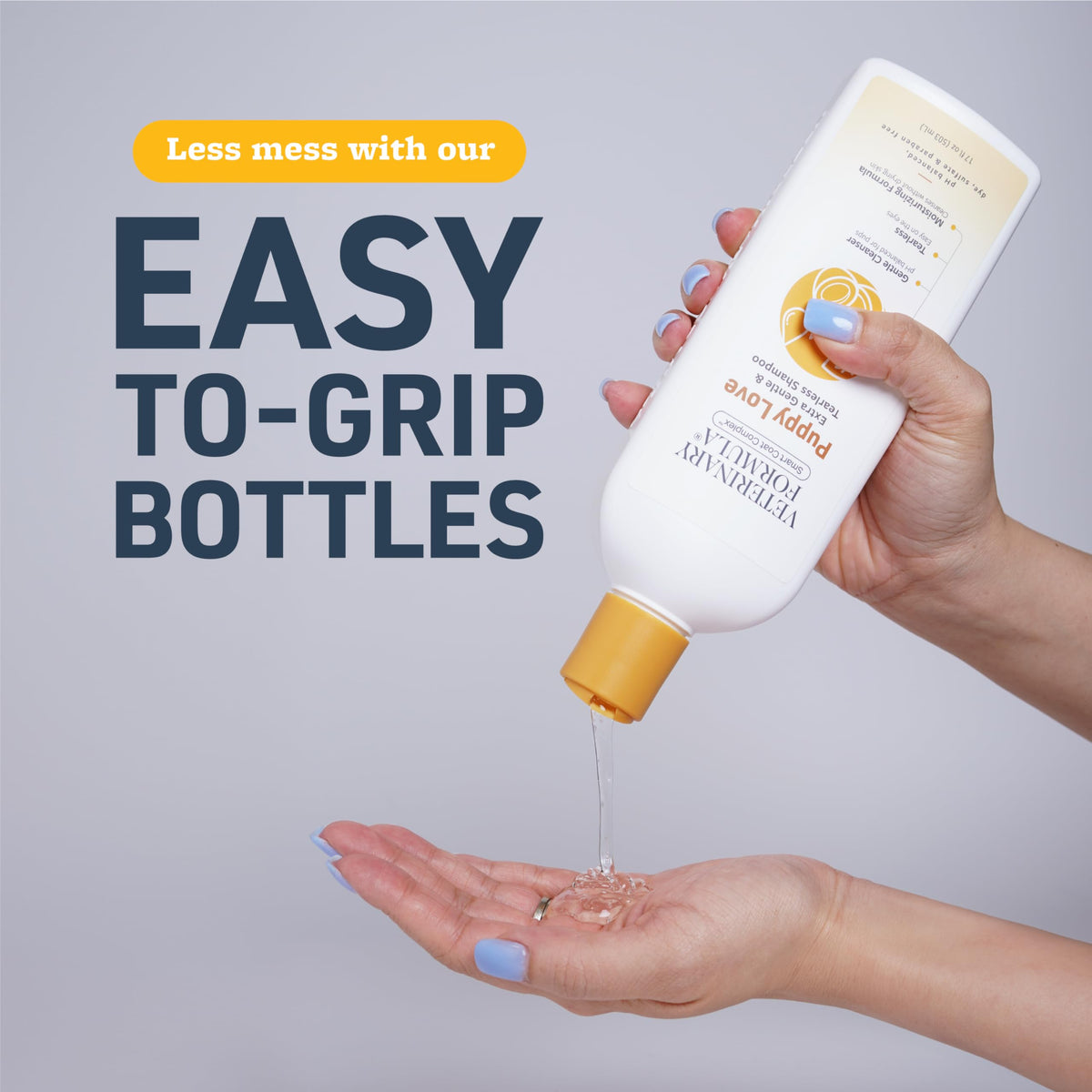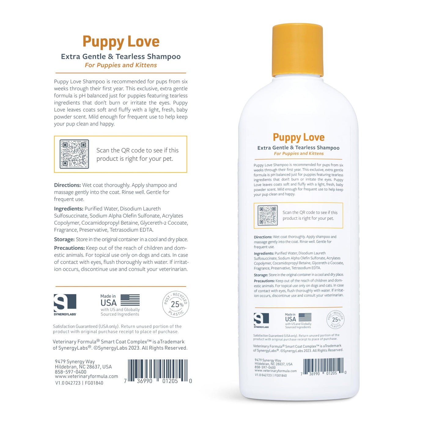 Like bringing home a new baby, when you bring home a new puppy you only want to use the gentlest cleansing products for their extra delicate skin. Veterinary Formula Solutions Puppy Love Shampoo is recommended by veterinarians for a puppy’s first year. Sulfate and DEA- free, this puppy dog shampoo cleanses without drying out a puppy’s delicate skin and leaves the coat soft and fluffy. Mild enough for puppies over 6 weeks, the tearless shampoo will not burn or irritate the eyes. The clean, fresh scent of the puppy shampoo is reminiscent of baby powder. It’s pet shampoo that’s light and not overpowering but remains after bath time is over. Perfect for delicious snuggles! The 17 oz. bottle of Puppy Love extra gentle shampoo is specifically formulated, and pH balanced for puppies. It is gentle enough for frequent use and will not wash away topical spot-on flea and tick treatments. We know that your puppies are more than just pets - they are immediately part of the family - so Veterinary Formula Solutions designs premium cleansing products that pet parents can actually afford. Your puppy will have a clean, soft and fluffy coat and you will like knowing that the extra gentle shampoo is designed specifically for a dog’s first year – making you both happy and able to focus on more important “firsts” like walks, fetch and snuggles.