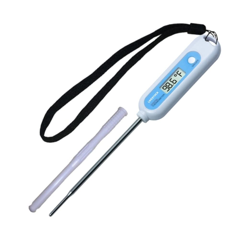 DIGITAL THERMOMETER FOR LARGE ANIMALS: The Veterinary Livestock Thermometer by MeterMall is built rugged enough for heavy- duty use on-farm, in the stable, at the veterinary clinic or at home. The 5-inch probe length is perfect for all types of large livestock, horses, and companion animals. FAST & ACCURATE: Fast, accurate temperature readings in as quick as 8 to 10 seconds. Measures from 90 F to 107F with +/- 0.1 F accuracy. The large easy-read 3/8 -high LCD blinks while stabilizing then emits an audible beep when accurate temperature is ready to read. Auto shut-off after 9 minutes. Thermometer reports Fahrenheit ( F) only. VERSATILE & SAFE: Designed of oral or rectal use in animals. Stainless steel probe is 3/16 (5mm) diameter with blunt end for safe insertion. Normal temperatures for common pets and farm animals are printed on the back. The tough durable plastic body and surgical-grade stainless-steel probe are designed for easy cleaning and disinfection. BUILT TOUGH: Tough, durable, plastic thermometer body (without probe) measures 4 x 1-1/8 x 5/8 and fits ergonomically in hand. The woven nylon lanyard loops comfortably over wrist. The hard-plastic friction-fit probe cover prevents damage and slides on and off with ease. a sturdy, protective polyethylene storage case. IN THE BOX: One Digital Livestock Veterinary Thermometer with 5-inch probe, protective probe cover, instructions and storage case. One-year warranty. 100% satisfaction guaranteed. Not for human use.