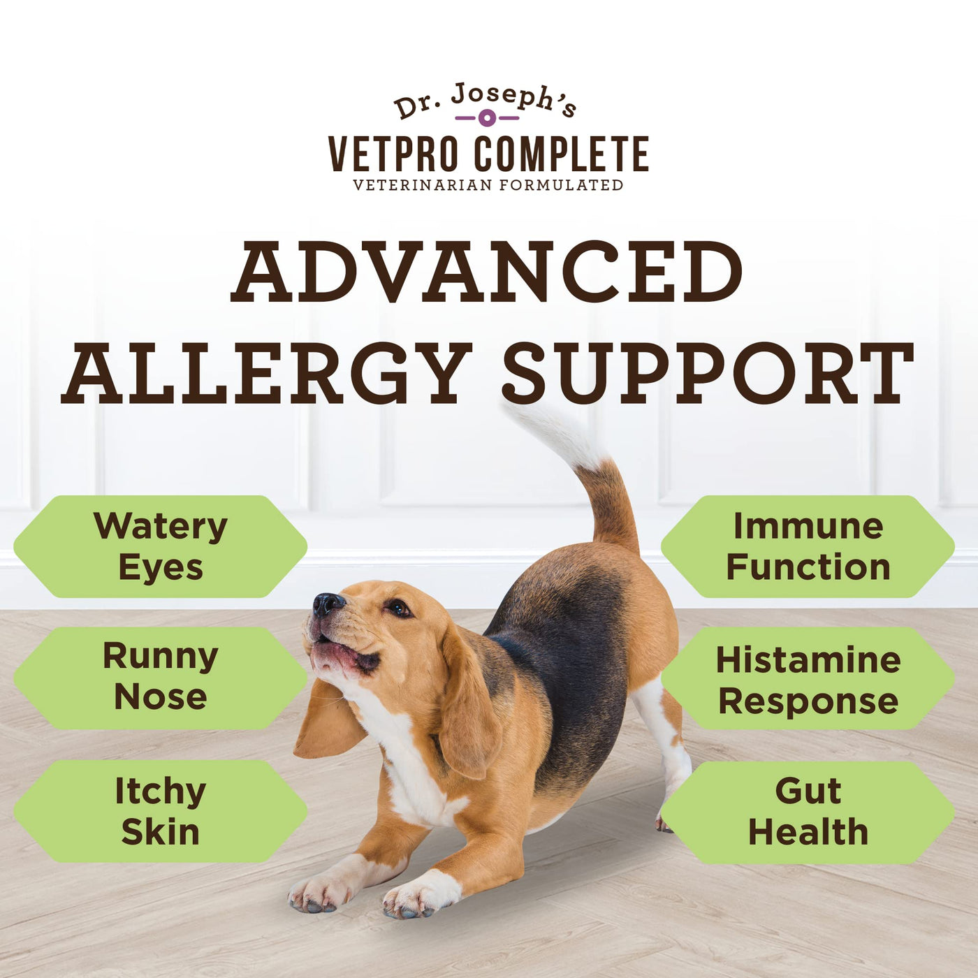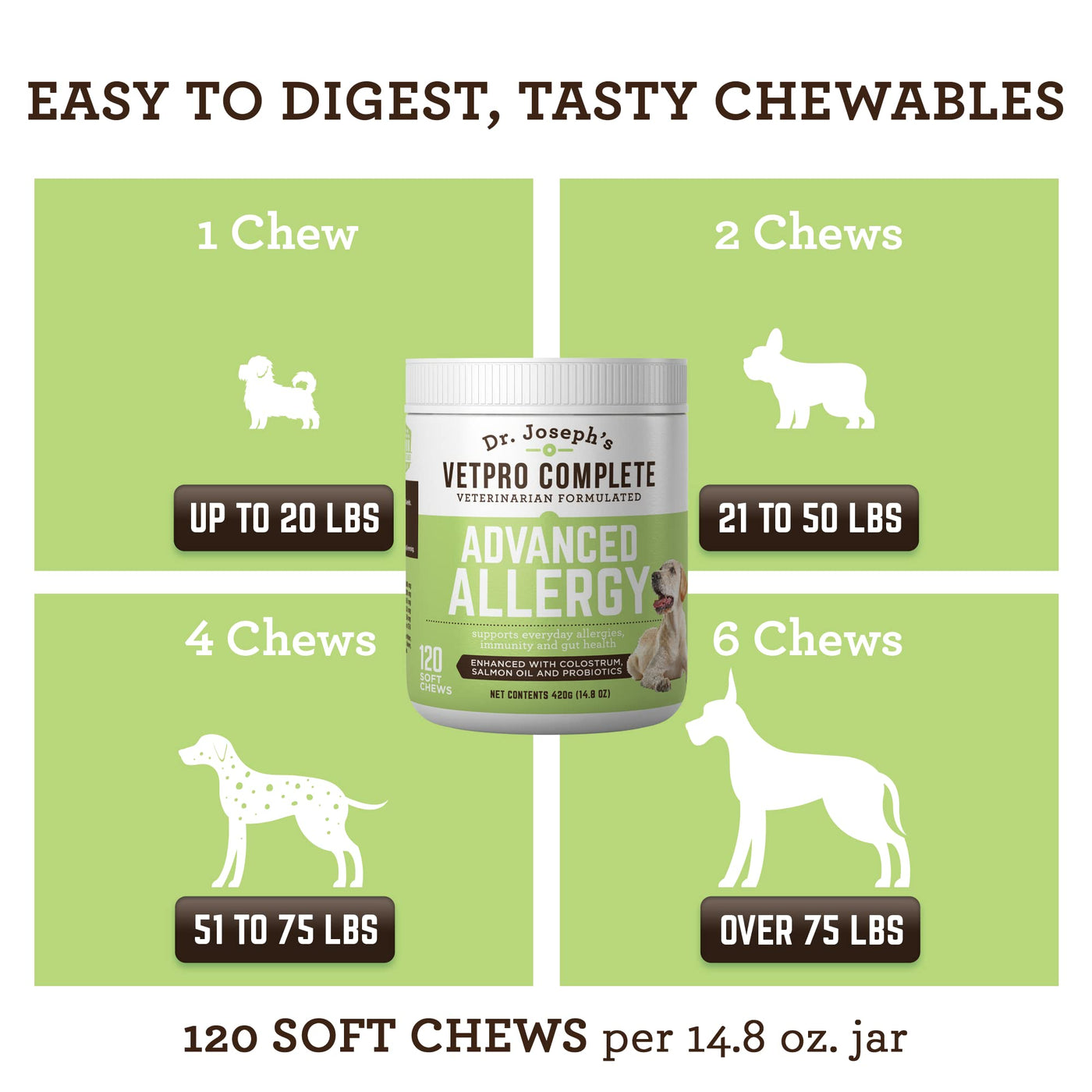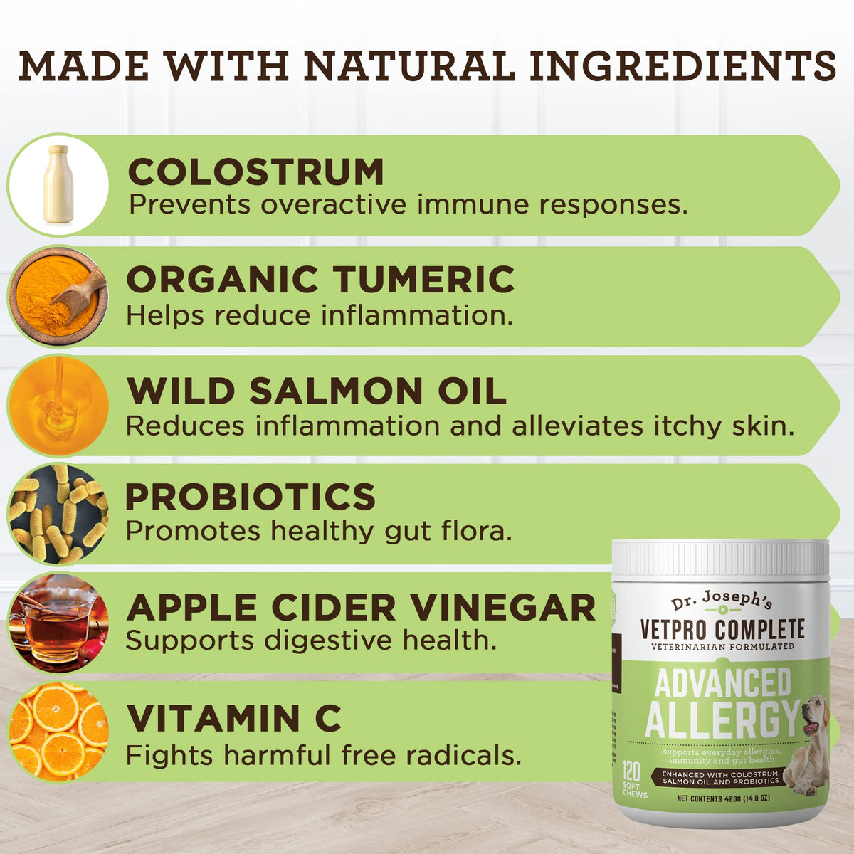 VetPro Complete Veterinarian Formulated Advanced Allergy was developed by Dr. Joseph, a doctor with over 40 years of veterinary experience, and an expert at improving the overall health and well-being of his patients. VetPros proprietary formula is backed by scientific research in the area of optimal canine functioning. Dr. Joseph and his team are focused on developing superior products with the best ingredients that are safe for your pets as well as the environment. Our advanced formula is the perfect trifecta: dog immune supplement, allergy support for dogs, and probiotic & digestive enzyme supplement. Our superior pet supplements are excellent for dogs of all breeds and size, and our Advanced Allergy formula focuses on key areas of your dogs health: Digestive Functioning - Probiotics ensure healthy stomach and gut health. Allergy Prevention & Relief - Omega 3 & 6 and Wild Alaskan Salmon Oil help prevent skin irritations, allergies, itch, and dryness. Apple Cider Vinegar balances the skins Ph levels, and organic turmeric reduces inflammation naturally. Immune System Booster - Packed with essential vitamins and minerals to maintain a healthy immune system and avoid illness and disease. Colostrum powder keeps the immune system in check to avoid overactive and under-active responses that can reduce optimal functioning. When combined, these essential elements are the key ingredients your dog needs for a long, healthy, and active life free from the discomforts of irritation, itching, and other unpleasant symptoms. VetPro is your trusted source for safe and healthy pets.