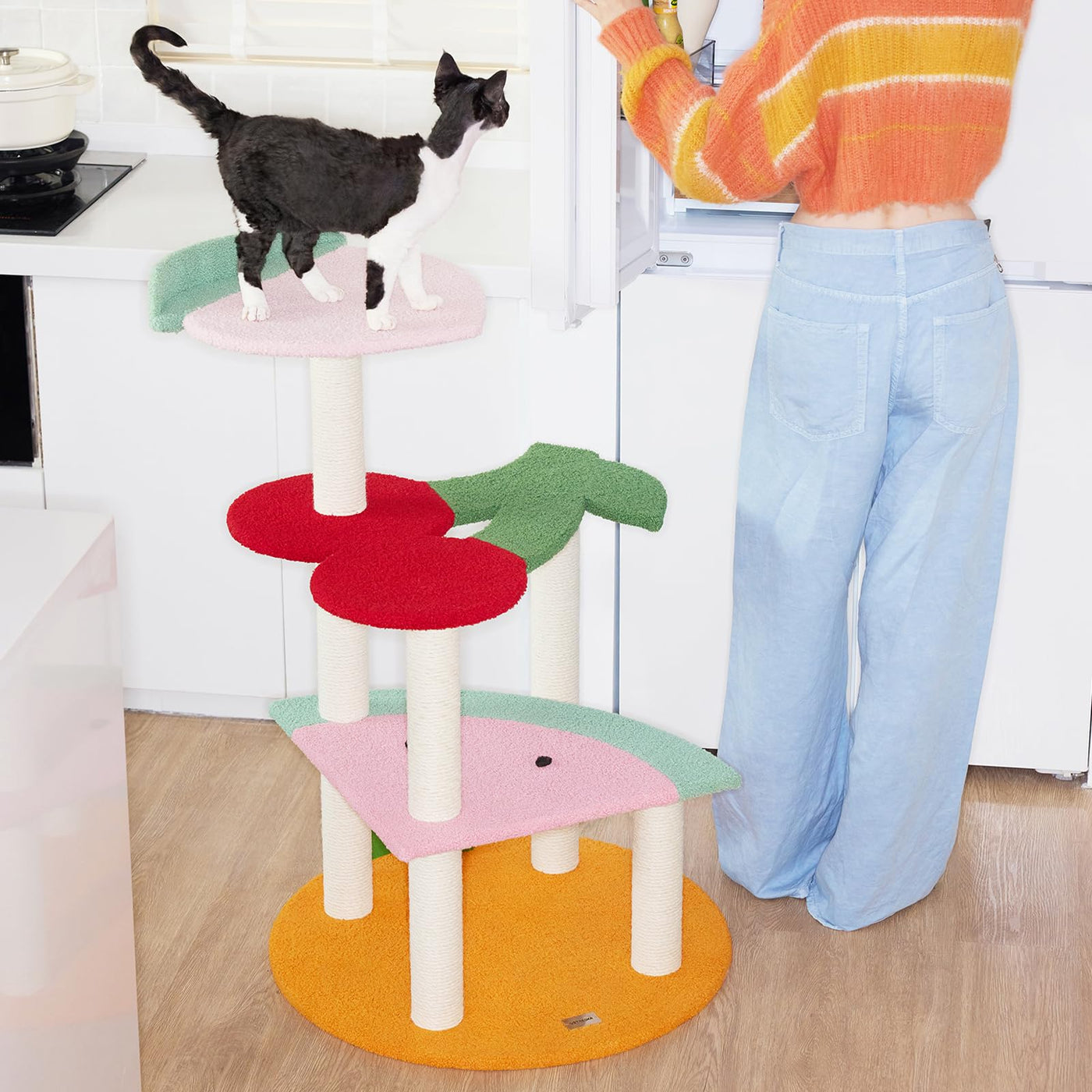 Q: How can I maintain the cat tree's cleanliness?A: To maintain cleanliness, you can easily wipe the Teddy velvet material with a damp cloth. Regularly check and clean the scratching posts to ensure they remain in good condition.