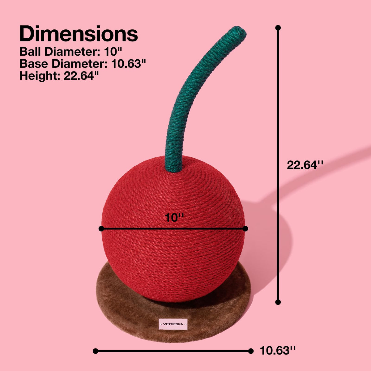 * Cat-Appealing Design - Vetreska discovered the strange habits of cats - like giant cacti and citrus or spherical fruits. Scratching is a natural feline behavior, which contributes a lot to the physical and mental wellness of cats. Thus, the cherry cat scratching post was born! Bright colors and lovely appearance will attract cats to scratch, exercise and play indoors to meet this instinctive need. Also can be a fun and visually appealing decoration in your home. * Premium Material to Ensure Safe Use - Our cat scratcher is purely handmade and passed the SGS test. High-quality harmless PVC pipe is wrapped with natural tight sisal rope from top to bottom, which is wear-resistant and corrosion-resistant, providing sufficient space for your lively kitten to extend the claws from all angles. The wide base provides reliable stability, prevents any chance of shaking or overturning, and fully supports the daily enjoyment of your energetic cat. * Assembles In Few Minutes - Just rotate the post and base to complete the installation, easily creating an interesting indoor cat gym. The cat climbing tree height measures 22.64', the base measure 10.63' in diameter, cherry diameter measure 10'.The appropriate size meets the complete vertical extension of cats of all sizes from kittens to adults. The minimalist design can be integrated into any decorative style, it's a perfect choice for modern cat furniture and Christmas gifts! * Meet Scratching and More Fun - This cat sisal sphere tower allows your little climbers to carry out daily climbing exercises and stretch their whole body every time they scratch. It will undoubtedly become your cat's favorite way of entertainment and decompression. VETRESKA provides various types and sizes of cat scratching posts to better fit kittens, adult cats and multi-cat families needs. If you don't know how to choose the right size for your cute kitty, please let us know. We are happy to hear your questions and provide suggestions.