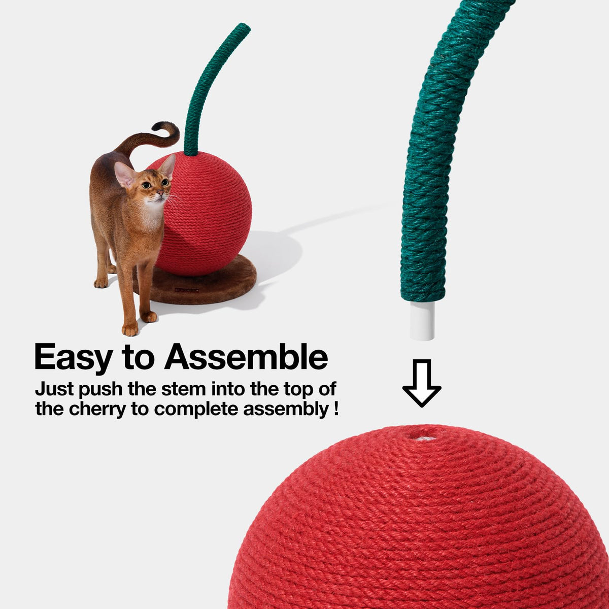 Q: Is the VETRESKA Cherry Cat Scratching Post easy to assemble?A: Yes, the scratching post can be assembled in just a few minutes by rotating the post and base together, allowing you to quickly create an engaging indoor gym for your cat.