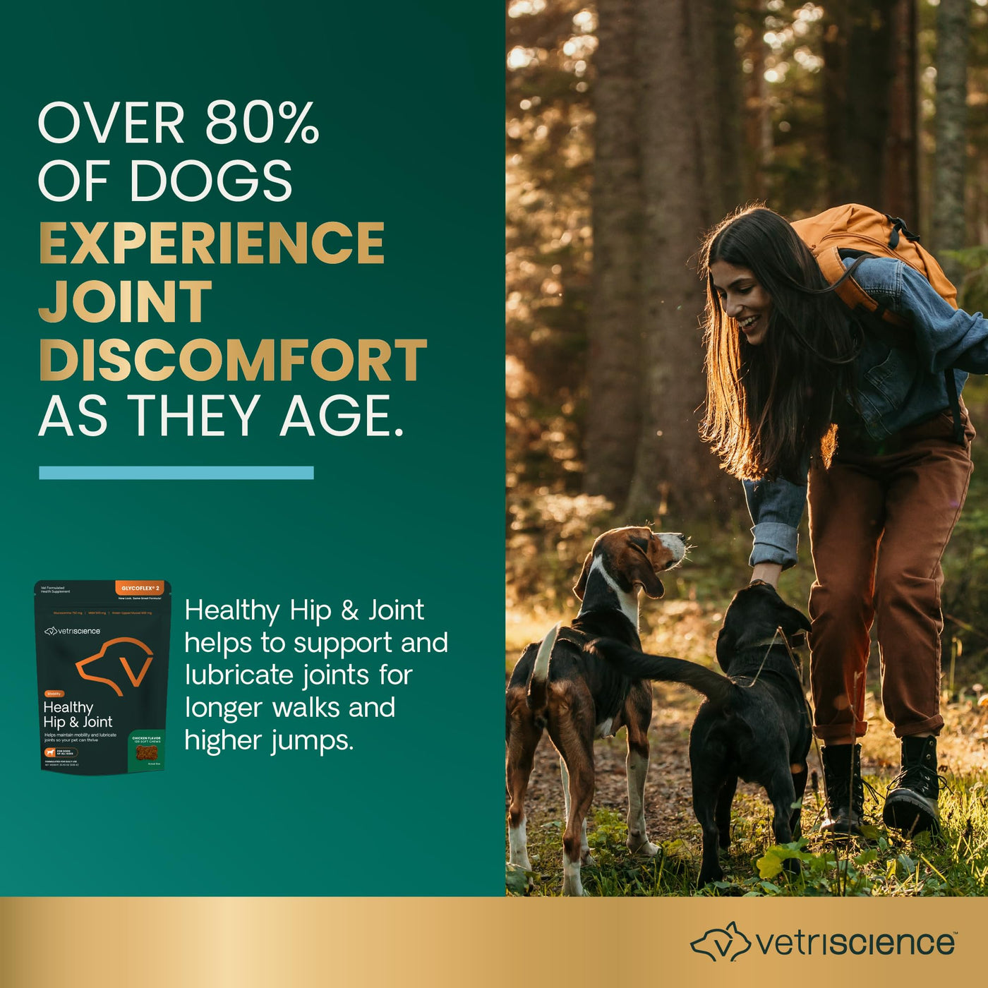 VetriScience Healthy Hip & Joint (new name, same great GlycoFlex Stage 2 formula) is the perfect daily glucosamine joint supplement for young, highly active dogs and adult dogs needing joint support and protection. This vet-formulated joint chew for dogs is made with nutritious, science-backed ingredients like glucosamine, MSM, and green-lipped mussel to help cushion and lubricate joints and keep your dog flexible and comfortable during everyday activities that may put stress on the body. Pet parents typically report seeing positive effects within 4 weeks of starting their dog on the Healthy Hip & Joint formula. To help protect your dogs joints from everyday stress and damage, or to put the pep back in their step, grab a bag of Healthy Hip & Joint today and see the results for yourself. Once dogs get a taste of the delicious flavor and chewy texture, theyll be begging for more