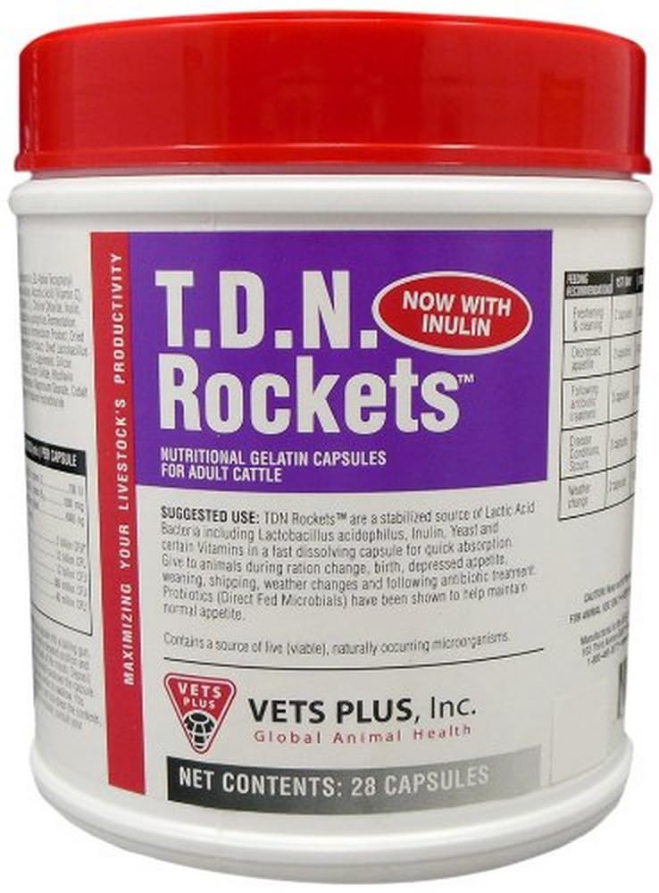T.D.N. Rockets are a stabilized source of lactic acid bacteria including Lactobacillus acidophilus, inulin, yeast and certain vitamins in a fast dissolving capsule for quick absorption. Give to animals during ration change, birth, depressed appetite, weaning, shipping, weather changes and following antibiotic treatment. Probiotics (direct fed microbial) have been shown to maintain normal appetite. Contains a source of live (viable), naturally occurring microorganisms.