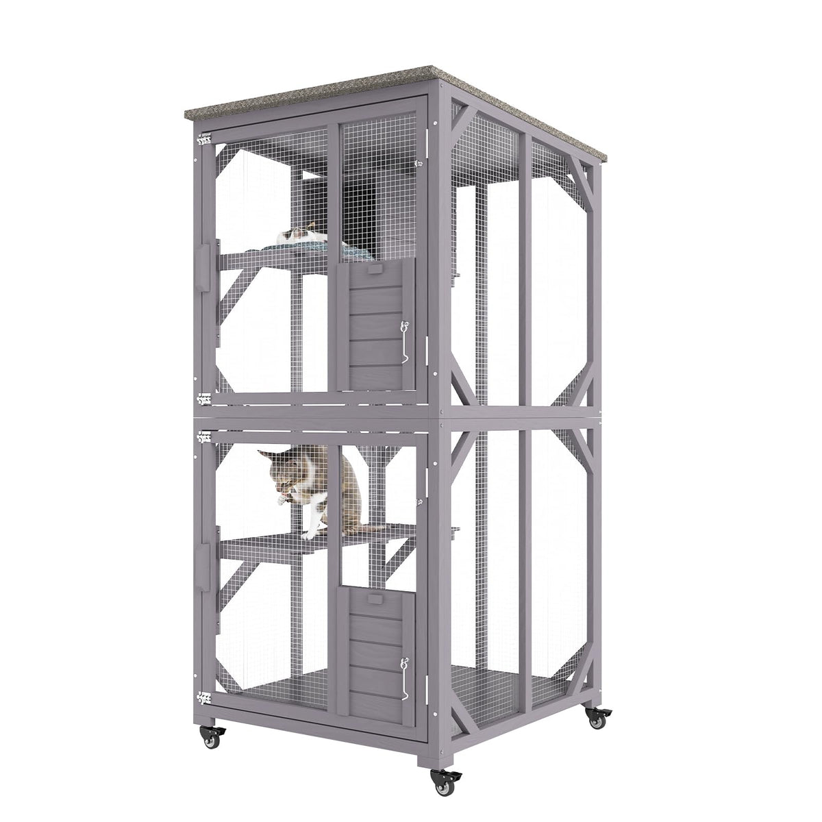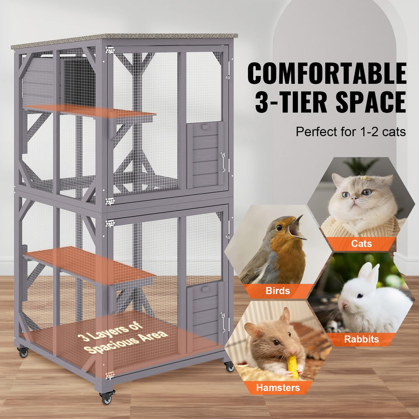 Spacious Space: VEVOR 3-tier wooden outdoor (or indoor) cat cage offers a spacious and comfortable home for 1-2 cats or other small animals such as birds, rabbits, or hamsters. Its product size of 29.9x34x53.5 inches provides ample space for pets to move around and play. We may suggest that this cat house be used for large or medium size cats (no small kittens) to jump or play around. | Elegance & Durable Cat Condo: Made of metal wire and fir wood, this cat catio boasts elegance and durability. Its rust-proof and sturdy design can withstand up to 30 lbs per tier and has an overall loading capacity of 90 lbs. The waterproof asphalt roof protects pets from sun and rain, which is perfect for outdoor and indoor use. | Easy to Setup and Use: Our outdoor cat enclosure comes with installation tools and a detailed instruction manual for easy and quick installation. You can also download the user manual online. | Practical Accessories: VEVOR large catio outdoor cat enclosure comes with 1 cat resting box for a comfortable sleeping environment, 2 large front doors, and 2 small windows with hooks. The small windows with handles are designed for easy opening. | Easy to Move around: With 4 wheels with brakes and a removable bottom tray, you can move this wooden cat playpen from indoor or outdoor, this catio outdoor cat enclosure provides an amusement park for cats to play and rest.