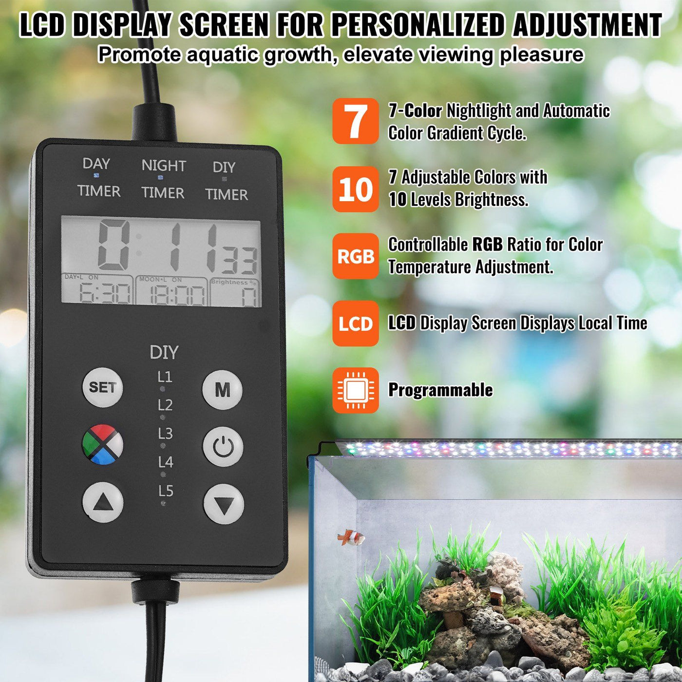 Highlights:1.Upgraded High-quality LED Lights: VEVOR high-power and high-lumen full-spectrum aquarium lights feature premium RGB5050 and 2835 monochrome beads offering uniform and stable lighting without flickering. Full spectrum lighting provides optimal illumination for fish and enhances visual comfort for you with energy-efficient and long-lasting performance up to 30 000 hours.2.Customizable Settings with LCD Monitor: You have the freedom to adjust the color brightness and RGB ratio of the lights according to your preferences. Enjoy 7-color night lighting and automatic gradual color cycling with options to set 10 levels of brightness and control RGB ratios. With programmable feature creating the perfect lighting for corals or fish promoting photosynthesis and growth of aquatic plants.3.All-Day Settings: Set the runtime to automatically simulate natural environmental light cycles 24/7 or customize timers for daytime and nighttime lighting separately. Power-off memory function ensures the fish tank light automatically returns to the previous mode after power restoration maintaining consistent and stable illumination.4.Waterproof and Durable: With IP67 waterproof rating you don't have to worry about splashes or other accidental drops of water. The high-quality fully sealed 1.2mm thick aluminum alloy shell provides more effective heat transfer and protects the full-spectrum aquarium light from humidity and water damage.5.Wide Applications: Designed for 30-36 inch aquariums VEVOR aquarium LED lights have 2 extendable brackets with a maximum single-side extension of 5.5 inch and dual-side extension of 11 inch making them easy to install on most glass or acrylic aquarium tanks with transparent hood/lid or no with rims or rimless. Suitable for both novice and seasoned aquarium enthusiasts.Details: Full Spectrum Light: Enhancing Aquatic Beauty Naturally Wake up the colors and embrace the beauty of nature. VEVOR aquarium light features high-lumen full-spectrum RGB5050 LEDs and 2835 monochrome LEDs delivering vibrant and uniform illumination while conserving energy ensuring longevity and enhancing the ambiance of aquatic environment. LCD monitor shows local time. You can adjust colors brightness and RGB ratios to create the perfect lighting environment for aquarium. The 24/7 natural light cycles along with 2 sets of timers for daytime and nighttime lighting allows for easy management of your aquarium. Never worry about resetting your full-spectrum fish tank light settings after a power outage. Our light automatically restores the previous lighting mode thanks to its power-off memory function ensuring consistent and reliable performance for your aquatic ecosystem. Say goodbye to flickering lights that discomfort your fish and observers. Our aquarium LED light emits gentle flicker-free illumination with a smooth spectrum providing a comfortable environment for your fish while allowing you to admire the underwater world with comfort. Adapt effortlessly to your aquarium space without taking up too muchsapce. Crafted with 1.2mm aluminum alloy shell for efficient heat dissipation our aquarium light fits tanks ranging from 30 to 36 inches seamlessly integrating into your aquarium setup for a visually stunning display.