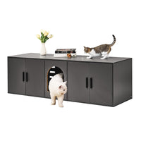 Hidden Aesthetic Design: The modern and simple multi-door cabinet not only provides private space for your pet but also makes your room look neater. The cat litter box enclosure can hide the cat litter box, perfectly matching the home decoration. Adopting a high-quality aluminum alloy handle, with a magnetic suction door, the opening is easy and smooth. | Spacious Space: Measuring 57.9x18.3x17.9in, this cat litter box furniture provides a comfortable and free resting space for pets. It can accommodate cat litter boxes with a length of less than 21.9 and a width of less than 17.7. It is equipped with 5 doors and a window, connecting two cabinets for cats to access freely. | Heavy-duty Loading: The top loading is up to 300 lbs/136 kg, with a firm and stable structure, for safely placing vases, books or other decorations. The cat litter cabinet can also be used as a cat house, tea table, coffee table or TV cabinet. It is stackable to maximize space utilization. | Premium Materials: The P2 grade particle board ensures the health and safety of pets and your whole family. The high-quality finish surface with smooth edges is waterproof, easy to clean and maintain, wear-resistant and damage-resistant, and not afraid of cat scratching. The board is pre-drilled and numbered for your convenience. | Versatile Use: In addition to being a cat litter furniture hidden, it can be a rest area for cats, as well as additional storage space. Suitable for living rooms, bedrooms or bathrooms and is easily integrated into the home environment without taking up extra space.