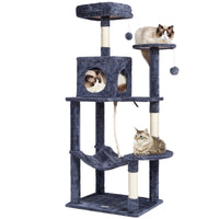 Highlights:1.Cat Activity Center: This multi-level cat tree is perfect for 1-4 small to medium-sized cats. Various height platforms allow cats to climb freely, satisfying their exploration needs. Whether the top or the low resting area, every cat can find their ideal space.2.Cats Cozy Haven: The cat tower features a spacious cat condo, top perch, and hammock, providing a private and secure resting environment. There are multiple platforms for cats to freely choose where to play and rest. Soft plush surfaces are gentle on cats skin and claws, ensuring a comfortable lounging experience.3.Joyful Playtime for Cats: Hanging ball toys and spring balls on the cat scratching tree attract cats attention, stimulating their playfulness. Sisal-wrapped scratching posts allow cats to stretch and exercise, keeping them active, relieving boredom and stress, and preventing furniture damage.4.Easy Installation: Pre-drilled holes make installation effortless. Our cat tree for indoor cats comes with detailed assembly instructions and all necessary screws, bolts, wrench, and expansion screw kits. Even first-time users of pet furniture can easily complete the setup, saving time and effort.5.Safe and Stable: Constructed with P2 grade particle board, the cat house is secure and sturdy. A wide base and thickened sisal poles ensure overall stability. Anti-toppling strap can be fixed to the wall to prevent tipping. Suitable for living rooms, bedrooms, balconies, and courtyards, and also ideal for pet stores, veterinary clinics, and pet grooming salons.Details: Creates a happy paradise for cats! Your cats can explore and rest freely on this multi-layer cat tree. Designed for multiple cats, it provides each cat with exclusive activity and resting areas while saving space in your home. A versatile activity and relaxation space for your cats! Let cats enjoy a comfortable and secure environment on this cat tower. With 4 different resting areas including a spacious base, cozy hammock, hidden cat condo, and soft top perch for cats to lounge, hide, or perch high. With dangling toys and sisal scratching posts, cats can play freely, reducing stress and boredom while maintaining healthy claws. Multiple platforms offer climbing fun, helping cats stay active and vibrant. Your cats will spend joyful days here. Safety is our priority. This cat scratching tree is made from P2-grade particle board, ensuring durability without odor. The large base and reinforced sisal posts further enhance stability. Anti-tip straps can be mounted to the wall for extra security. Modern, minimalist cat house with a light gray finish that blends effortlessly with any home decor. Whether in the living room, bedroom, balcony, or courtyard, it adds a beautiful touch to your home. Its not just a paradise for cats but also a stylish decor in your home.