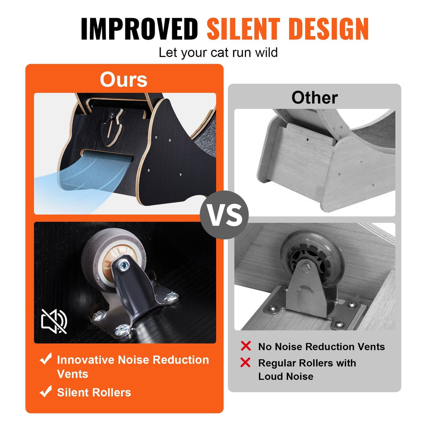 Q: Is the VEVOR Cat Wheel Exerciser noisy during operation?A: No, the VEVOR Cat Wheel Exerciser is designed with an integrated silent wheel and noise-reduction features. This double noise reduction design allows your cats to exercise quietly, creating a pleasant atmosphere for both pets and owners.