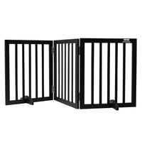 Chic & Functional Design: This free standing dog gate stands out with its unique modern and stylish design. Crafted with a sturdy solid wood frame, it provides excellent functionality and seamlessly blends into your home decor. Whether your home style is classic, Scandinavian, or modern minimalist, this gate effortlessly complements it, adding a touch of sophistication and warmth to your living space. | Flexible & Foldable: No more gate frustrations! Our quick-release hinge system lets you customize the width effortlessly. Whether you need the freestanding pet gate for wide doorways, narrow hallways, or even staircases, it adapts perfectly. When not in use, it can be quickly folded and stored in cabinets, under the bed, or any small space without taking up your indoor space. | Stable and Sturdy: The freestanding folding dog gate is equipped with two anti-slip foot supports, ensuring exceptional stability in various positions, eliminating concerns about tipping over and safeguarding your home. Plus, it comes with silent foot pads that protect your floors and create a peaceful environment for you and your pet, free from loud noises. | Easy Assembly: You can assemble the wooden dog gate in just 30 seconds and then place it anywhere in your home. Whether it's at the kitchen entrance, bedroom, bottom of the stairs, or other areas, you can easily set clear boundaries for your pet without the hassle of a complicated installation process. | Product Dimensions: The fully extended width of our foldable dog gate is 60'. A single gate panel measures 20' Wx 24'H. There are 4 panels in total.
