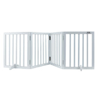 Chic & Functional Design: This free standing dog gate stands out with its unique modern and stylish design. Crafted with a sturdy solid wood frame, it provides excellent functionality and seamlessly blends into your home decor. Whether your home style is classic, Scandinavian, or modern minimalist, this gate effortlessly complements it, adding a touch of sophistication and warmth to your living space. | Flexible & Foldable: No more gate frustrations! Our quick-release hinge system lets you customize the width effortlessly. Whether you need the freestanding pet gate for wide doorways, narrow hallways, or even staircases, it adapts perfectly. When not in use, it can be quickly folded and stored in cabinets, under the bed, or any small space without taking up your indoor space. | Stable and Sturdy: The freestanding folding dog gate is equipped with two anti-slip foot supports, ensuring exceptional stability in various positions, eliminating concerns about tipping over and safeguarding your home. Plus, it comes with silent foot pads that protect your floors and create a peaceful environment for you and your pet, free from loud noises. | Easy Assembly: You can assemble the wooden dog gate in just 30 seconds and then place it anywhere in your home. Whether it's at the kitchen entrance, bedroom, bottom of the stairs, or other areas, you can easily set clear boundaries for your pet without the hassle of a complicated installation process. | Product Dimensions: The fully extended width of our foldable dog gate is 80.3'. A single gate panel measures 20' Wx 24'H. There are 4 panels in total.