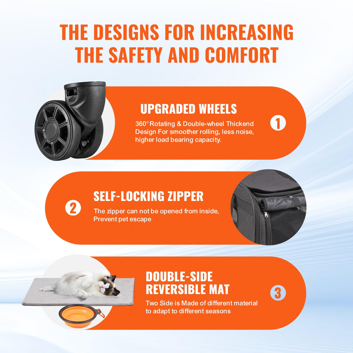 LARGE CAT CARRIER&DURABLE:Made of 600D Oxford cloth thickened fabric to ensure the durability and sturdiness. The size of pet carrier is 25.5/65cm (L) x 14/36cm(W) x 14/37cm (H) and can hold up to 35lbs/16kg. Please check the size and weight of your pet to determine if the room of this rolling pet carrier is enough. | UPGRADED WHEELS DESIGN: VEVOR rolling dog carrier wheel is improved. It not only is 360