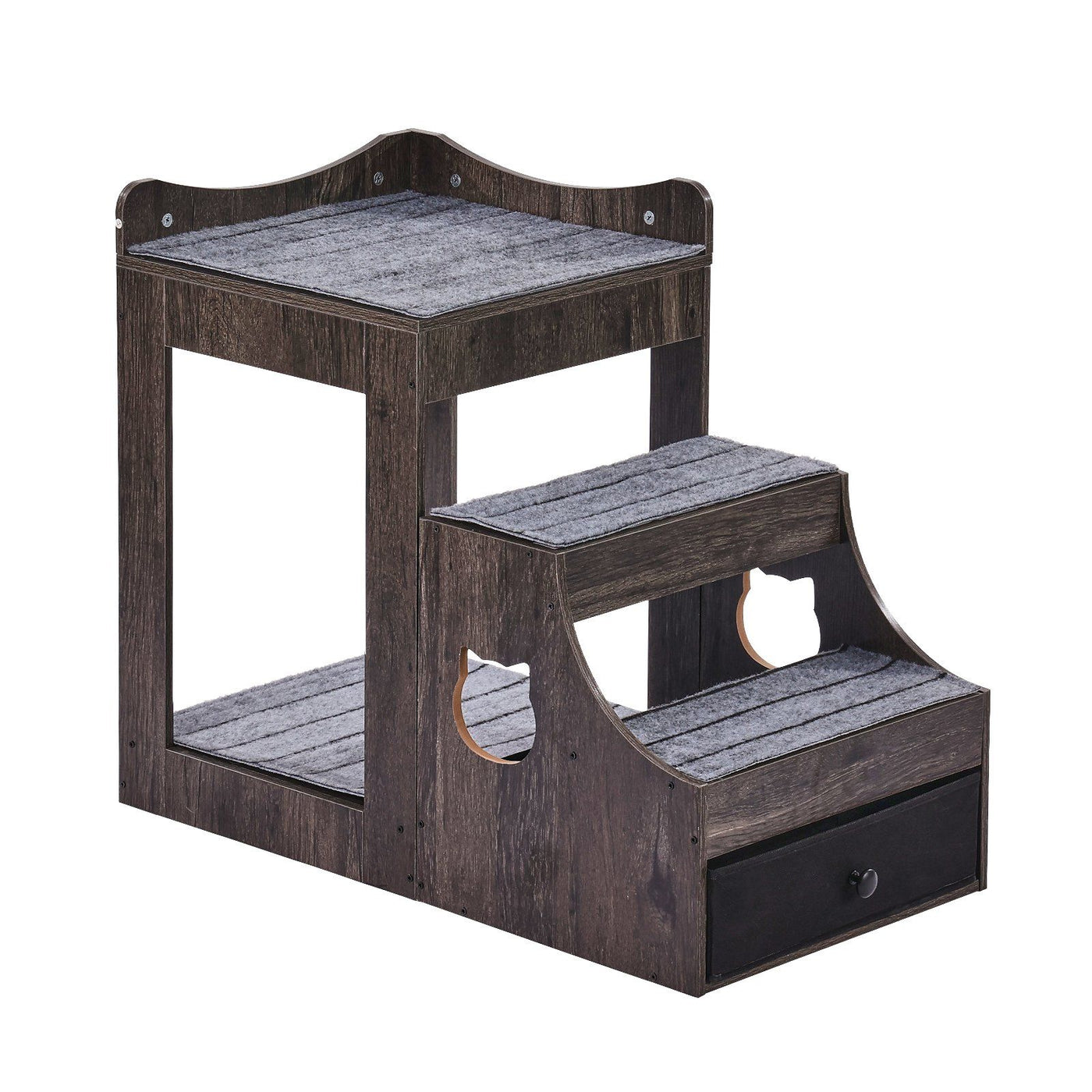 Highlights:1.Multifunctional Design: Combining the double-decker pet bed and the pet ladder into one, the pet window perch can provide pets with both upper and lower double resting space, so pets can choose where they want to rest, and it can also be used to accommodate 2 or more pets at the same time, saving space. The pet ladder can be used separately, with the help of the ladder pets can easily climb up and down, avoiding the impact of frequent jumping on the joints.2.Sturdy And Durable: Built with high quality wood, with solid structural support, the whole is not easy to shake, your pet can play to their hearts content.3.Not Easy To Slip And Fall: Taking into full consideration of the pets habit of jumping up and down, we have designed the appropriate height and width of the stairs for the pet climbing ladder, and each level of the stairs is covered with non-slip mats, which greatly increases the safety of your pets activities and gives you more peace of mind.4.Freely Movable: The dog bunk bed can be freely moved to every corner of the house, placed next to the window, pets can enjoy the sunshine and the scenery outside the window, can also be placed in the bedroom, accompanying the pets to sleep together; as a stand-alone pet climbing ladder, placed next to the sofa, to help pets jump on the sofa, and spend more leisure time with your pets.5.Storage Organization: Utilizing the space underneath the stairs, a storage drawer is set up, which can be convenient for storing some pet supplies, such as food, canned food, toys, quilts and other items.Details: Professional Window Perch For Pet Inside Pet bunk beds are specially designed pet furniture for canines or cats, equipped with stairs for easy up and down, providing a resting area for pets, while the bunk beds support pets to observe the scenery out of the window or high up, and can sleep off the floor to reduce the effect of moisture on the floor. VEVOR Double Decker Pet Bed is a multi-functional product combining a double-decker pet bed and a pet climber, featuring spaciousness, anti-slip and wear-resistant, and durability, which enables your pets to climb and rest comfortably, safely and easily. Perfect for placing in different places in your home, such as at the end of the bed, next to the sofa, next to the dining table, to promote interaction with your pets and enhance their relationship. The pet ladder can be used alone, placed next to the sofa or bed, pets can use the stairs to climb up and down, reducing the pressure on joints. For short, old and frail pets, the bunk pet bed provides a comfortable space for sleeping and moving around, allowing pets to enjoy more fun time.