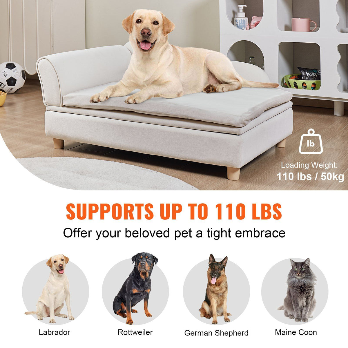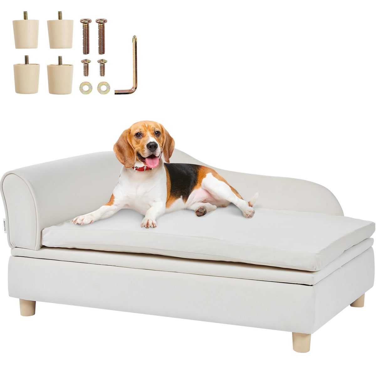 Suitable Size: Our pet sofa, measuring 36x23x16 inch, offers spacious comfort for pets of various sizes, Chihuahua. Crafted with sturdy solid wood and plush fabric, it's durable and ideal for multi-pet households. | Peace of Mind Load-Bearing: With a robust capacity of 60 lbs, VEVOR dog sofa provides strong support for breeds like Labrador or lively Rottweilers, offering a secure retreat for your pets. Recommend pet types: small-sized dogs and cats. Note: Pets under 30.7' in length can lie flat. | Premium Materials: The soft velvet surface of this dog sofa bed is scratch-resistant, and easy to clean, allowing pets to rest comfortably while reducing cleaning burden. The interior is filled with high-density sponges to support your pet’s joints and protect their health. | Practicality Meets Style: More than just a pet accessory, our dog sofa couch complements your home decor effortlessly. The smart design of storage cabinets frees up space, and its appearance blends seamlessly with any interior style. | Easy Assembly: The white dog bed couch is easy to install without complicated steps. Done by one person! Suitable for various places, whether in your living room, bedroom, pet store, or clinic, enhancing your pet's quality of life.