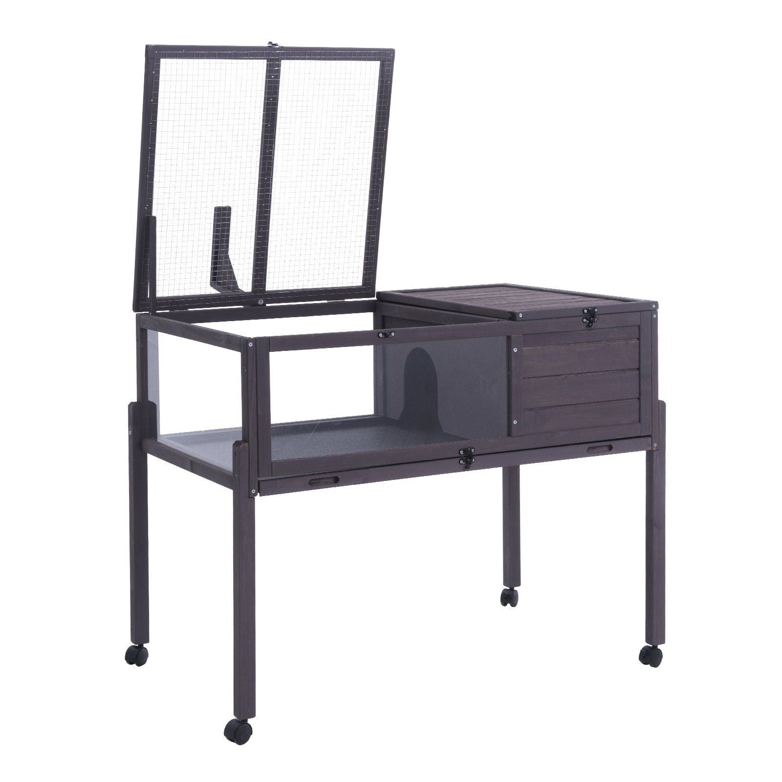 Highlights:1.Spacious Two Rooms: Our tortoise house features two separate areas: a private sleeping area with a solid wood top and an open activity space with a metal mesh window. With a large size of 38x24x32.5/965x610x825 mm and a high stand with lockable wheels, its perfect for indoor and outdoor use. Enjoy sleeping indoors and sun exposure outdoors!2.100% Cedar Construction: Crafted from high-quality cedar wood, this tortoise habitat is sturdy and durable with a tight grain that resists warping. Coated with water-based paint, it is waterproof, ensuring a safe and comfortable living environment for your pet.3.User-Friendly Design: To support your pets health and your convenience, the tortoise enclosure includes a hanging light stand for heating control. The top covers two areas open for easy interaction, and high-transparency ABS side panels allow close observation. A locking latch prevents escapes, giving you peace of mind.4.Easy-Clean Plastic Tray: The fully covered plastic tray prevents it from damaging the wood, extending the enclosures lifespan. Its easy-to-clean surface requires a quick wipe with a damp cloth, keeping the interior clean and promoting your pets well-being.5.Simple Assembly: Designed for easy setup, the turtle enclosure includes pre-drilled holes and assembly instructions. Even if youve never assembled similar products, you can effortlessly assemble them and provide a sturdy, comfortable home for your pet!Details: Provide a Spacious Space for Tortoises Activity and Living! Our tortoise house is made of premium cedar wood, known for its dense texture, durability, and resistance to deformation. The exterior is coated with waterproof paint. The high-quality metal mesh top is tightly woven, providing a safe and comfortable living and entertainment space for your pet. The included hanging light stand makes it easy to focus light on your tortoise, allowing you to observe its behavior and health. Proper lighting supports its well-being and growth. With a generous 38"x24"x32.5" space, the tortoise enclosure includes a private sleeping area with a top and a public viewing area with a high-transparency ABS side panel. The lockable top cover with a high-density mesh effectively prevents pets from escaping. Suitable for various small animals. The high-leg frame with wheels allows easy movement indoors and outdoors, with two lockable wheels ensuring stability. Let your tortoise enjoy fresh air and sunlight for optimal health. Each panel is pre-drilled and labeled with assembly sequence markers, and a clear instruction manual is provided. You can easily and quickly build a comfortable home for your pet.