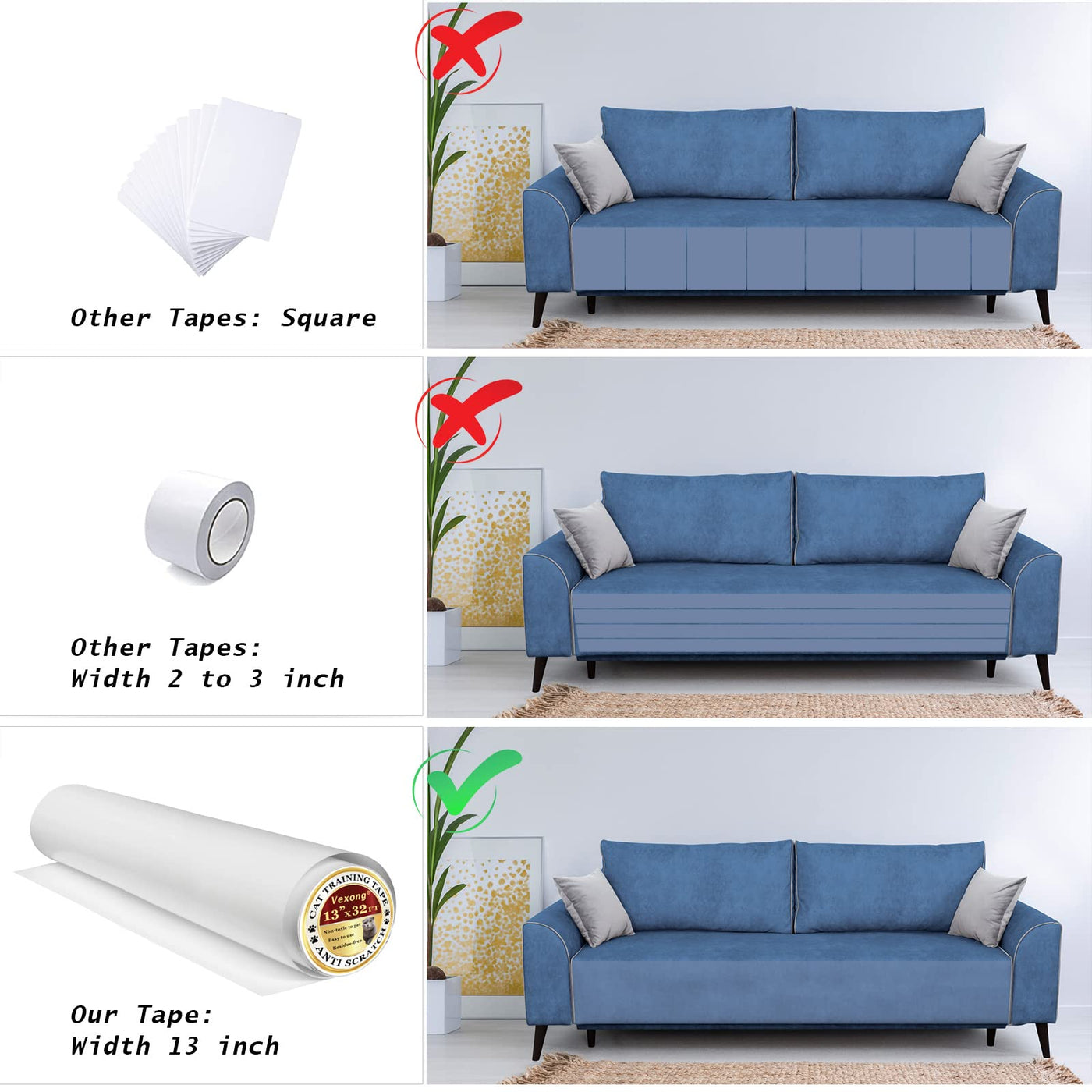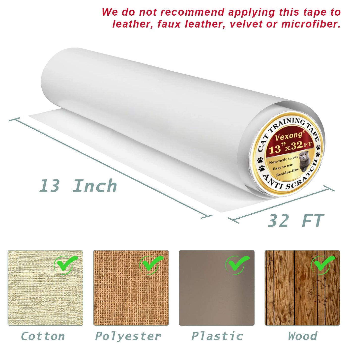 cat Dog Scratching Pad TapeThe product size is 13 IN*32 FT Large size design can provide a large protection area for the furniture It is easy to cut and apply very convenient to use This Anti-scratch cat Training Tape helps To train your cat to stop scratching furniture and save your furniture from paw scratches can protect most of the furniture as couches chairs walls fabric sofas tables car interiors doorways atest MaterialVexongs cat scratch tape is made of the latest material The tape is clear wear-resistant and with a smoother surface This cat scratch furniture protector is more invisible It can provide better protection (Note: We do not recommend applying this tape to leather faux leather velvet and microfiber) Easy to Use and RemoveThis tape can be cut according to your needsAfter cutting size just tear off the backing paper and stick it on the surface that needs to be protectedThe cat scratch pad can also be applied to the seats of your carcut to a suitable length remove a part of the backing paper at both ends then stick it to the car seatsYou can travel with your pet rest assured without worrying about your pet will damage to the seat coverThis tape will not leave traces after being removed ano Stickers & Twist PinsThere are 70 pieces of nano stickers and 40 pieces of twist pins in the package The nano stickers and twist pins provide extra securing solutions to keep the tape in place The nano stickers can also be used to fix light things onto the wall or table such as photo frames paintings decorations and remote controls The nano stickers are residue-free too Environmentally friendly and Safety The product is environmentally friendly recyclable and non-toxic It is harmless to the body of people and pets If you are not satisfied with the product please contact us