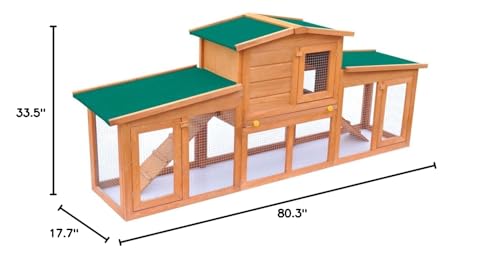 This 2 layer quality hutch provides a large cozy place for keeping small animals, especially cute rabbits. It features multiple uses: playing, exercising, training, or simply keeping your pets safely. This rabbit hutch provides your pets with plenty of exercise space while the tight iron wire mesh helps prevent mischievous behaviors and unexpected accidents. Meanwhile, the construction of iron wire grid ensures your monitoring of the pets and enables your pets to keep an eye on the surroundings and get enough fresh air. The rabbit hutch is built with a high-quality wood frame, making it a strong and safe enclosure that lasts for years. Its green roof keeps rain away while the cozy cubby makes the perfect sleeping area. Two easy-climb ladders lead from the lower ground level to the upper floor. The pull-out tray makes cleaning easy. And the doors close easily and lock with slide-bolt latches. This spacious wooden rabbit cage is perfect for small pets.